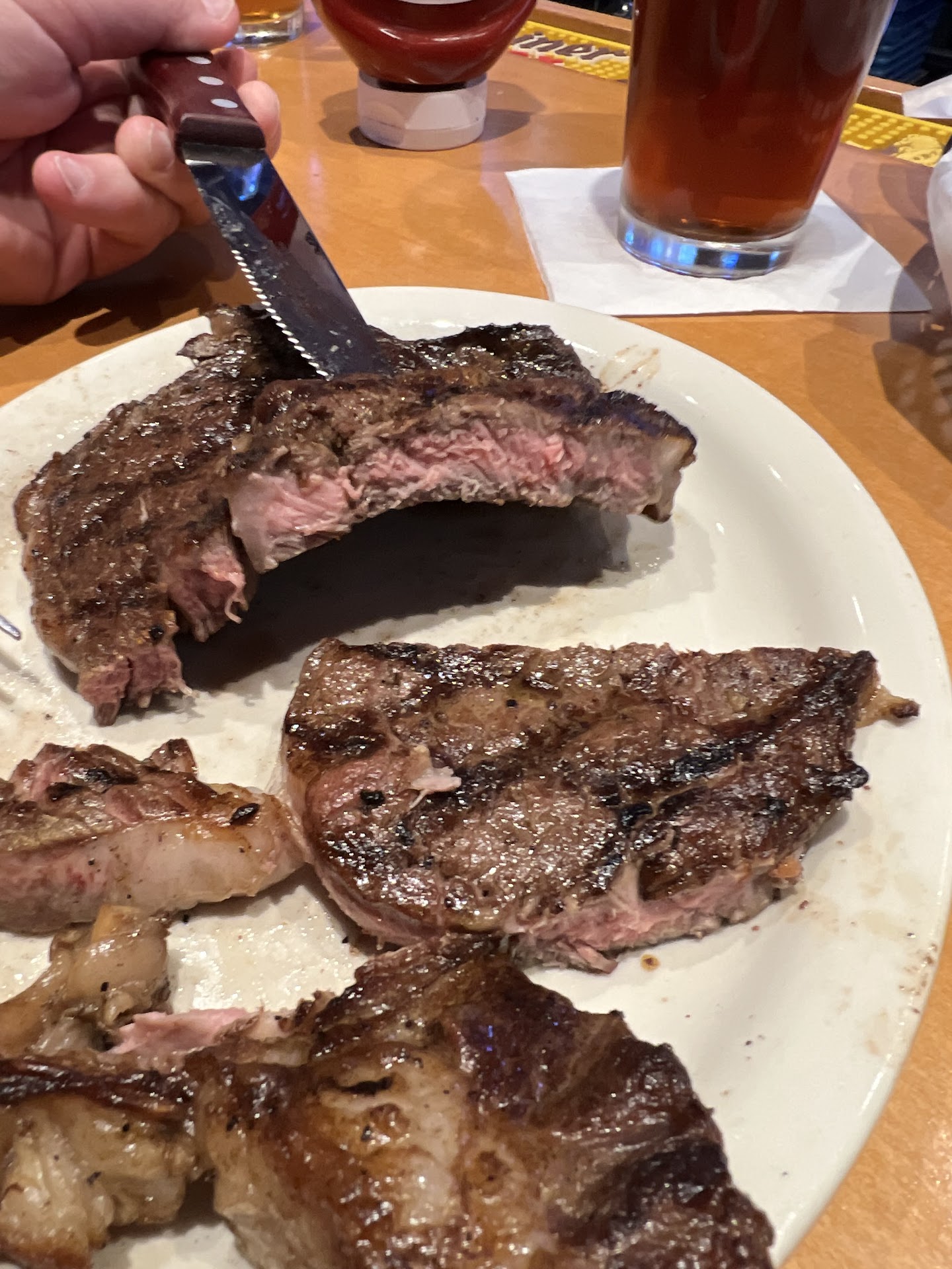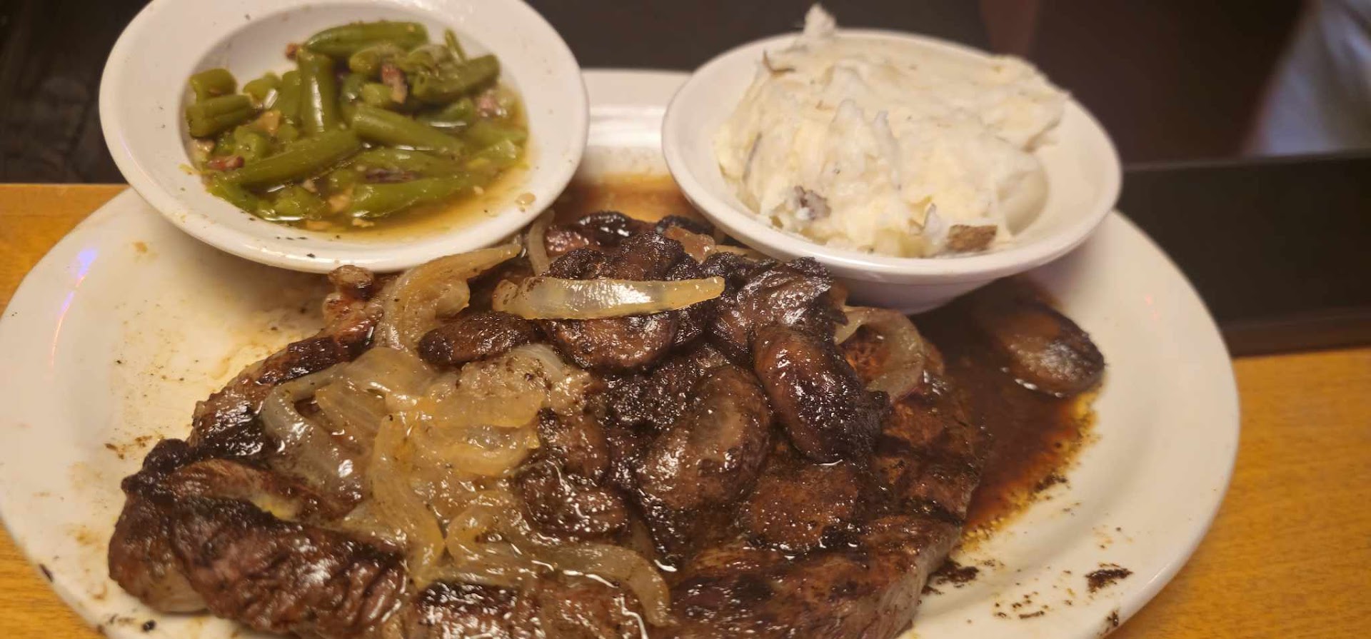 For entrées, we ordered the Half Slab Ribs and the Ft. Worth Ribeye. The ribs, while tasty, were slightly overcooked—something the manager had warned might happen depending on the cook. The ribeye was well-cooked (medium) and flavorful, but the steak sauce wasn’t great. Both meals came with mashed potatoes and green beans, which were well-seasoned and satisfying.