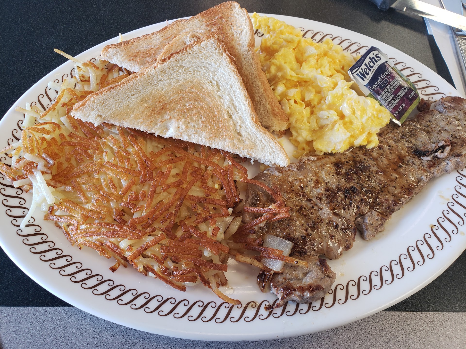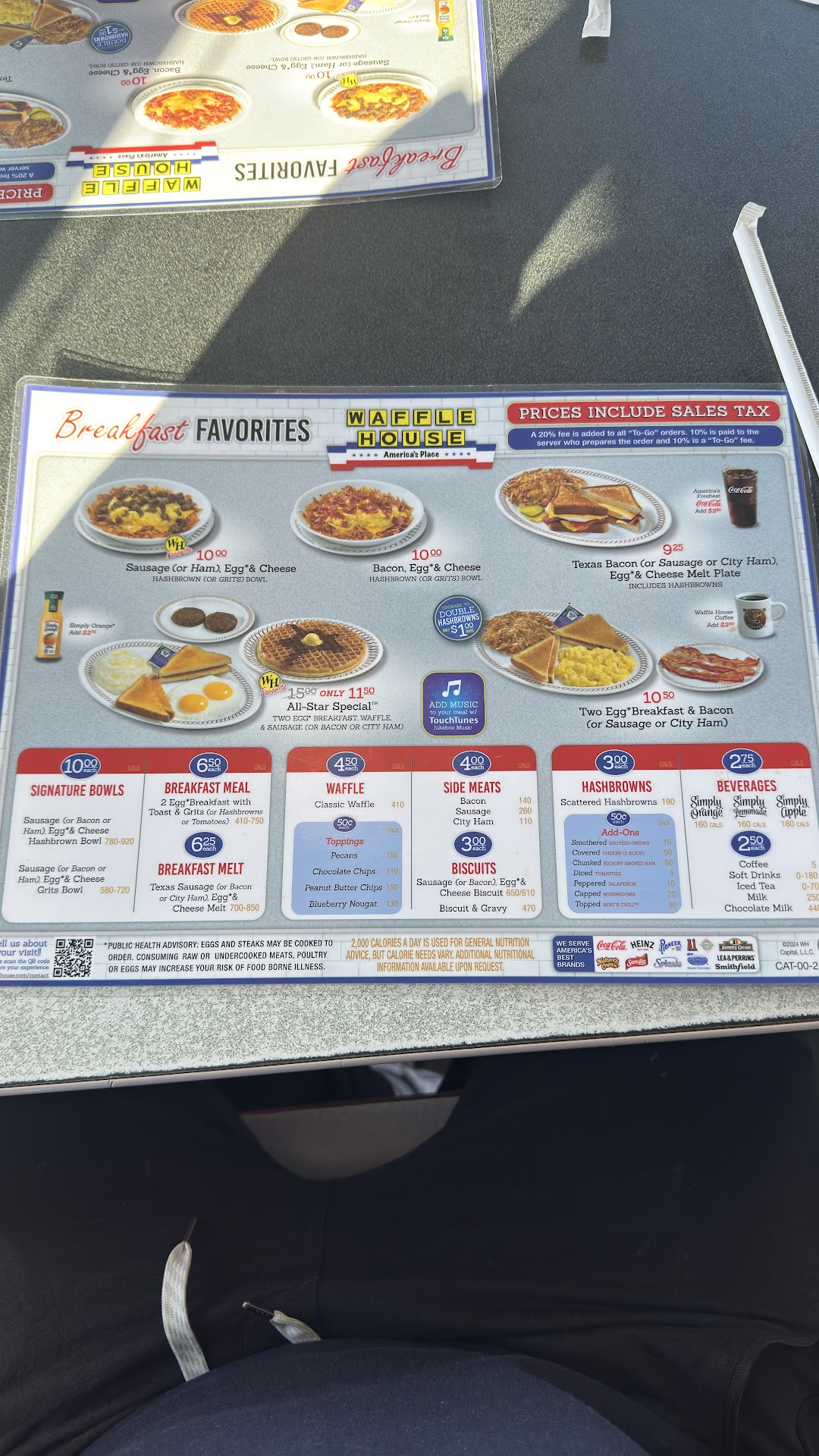 Read moreWent in around 8am on weekday. Staff greeted us and we seated ourselves. Hostess delivered our silverware and took our drink order right away. We immediately noticed the air conditioning was going and it was very cold. We had dressed for a warm day and had left our jackets in the car. Our server took our order right away. Was going back to car for jackets when our server brought everthing except the waffles, bacon and sausage. Those followed about 3 minutes later. Everything was hot and tasty. Only complaint was the waffle was overcooked and hard. (I noticed that while we were waiting for our order the cook had opened the waffle maker and was trying to pry off the top and bottom of the waffle without tearing it. Once he got it off he patted it down onto the other part of the waffle. He had gloves on otherwise we would have refused them. As we left I noticed other customer's waffles were also hard and overcooked. We have been to several of the Waffle Houses in the area and have not been served one like this. Must of had an issue with the...