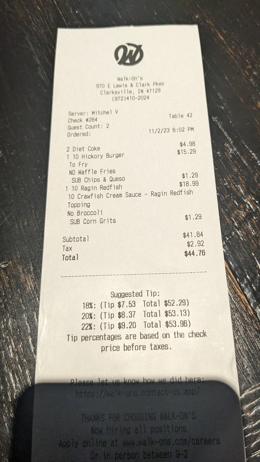 Walk Ons cannot charge $15. 99 for crawfish etouffee that would not fill up a quarter of a bourbon drink glass at the bar! It was that little of an amount of food.. then it looked like the chef took no more than two or three crawfish and chopped it up in the tiny little pieces. The pieces were smaller than BBs. How could I enjoy this food. The roux was okay. However, if you know you're not getting your money's worth it's really difficult to enjoy a meal. If you want really good Cajun food in Louisville just go to J Gumbo's because you will get a larger portion that's worth it and the food is good. Also there's a restaurant in Indianapolis run by a gentleman from New Orleans called Yatz. A lot if you want great food where the portions are huge and it is very inexpensive you need to visit that place. As a matter of fact maybe the chef and owners need to visit Yatz to understand value of portion size. Even my server warned me of the portion size. However, I tried it anyway because I love crawfish etouffee. It just wasn't worth it. My server was very good though. I just wanted to try the crawfish etouffee but when you just have maybe eight teaspoons of a meal and you don't even know what the meat is in the meal because it's job so fine you can't tell it's not what's coming back at all. Every great crawfish has whole crawfish in it !! The beignets were good though even though they were chopped up into frosted mini wheat sizes. This was the second time coming back also because the server before said you got to come back and try the cage and it's great! It's not especially for value standpoint. The first visit I had the double burger and fries and it was okay. You could go to Bubba's 33, Jagger's and get a much better burger. That doesn't even include all the local places in Louisville that has better food from a burger standpoint especially.. In closing you're just not getting your money's...
