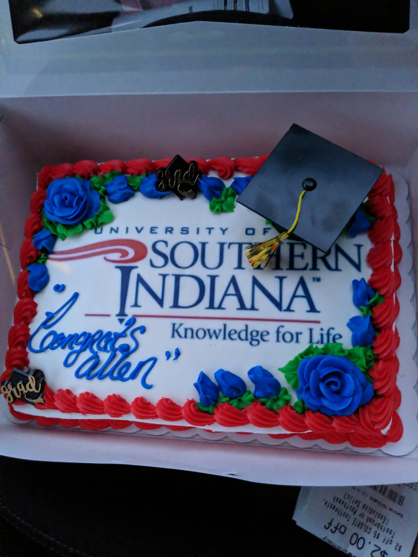Read moreI had a last minute request for a graduation cake for my son at college. It's in Evansville, so I really didn't think about it but he wanted a little Party at a place in Evansville, so last minute I thought that would be nice. I called three places and none of them said "they could even whip something up" until William's Bakery. The only ideas I had were on Pinterest, and most of them took a lot of preparation. But they found a USI picture and copied it on the front, put a grad hat, few roses, and Congrats Allen!!! It looked great! I was so impressed...called at 9:00 and picked this up at 5:30. (See below) I'm sold...for them to rush this for me when they don't know me from Adam shows true respect. I know where I'm getting any cake needed...