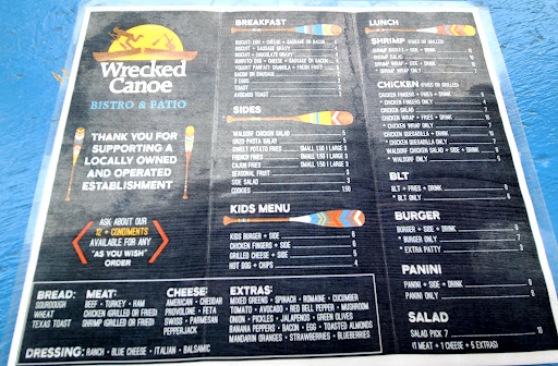 Read moreStopped into Wrecked Canoe today for a quick lunch while on the road traveling. Cute place. The waitress was working alone I believe, so our visit was almost two hours long due to short staffing. There was only one other couple dining in, so not sure what was going on. We were able to get one person's drink refill after an hour only after asking. The other two people would've liked refills too, but finished their meals dry. The waitress just was not to be found. We ordered two salads and a cheesburger. Nothing fancy. They ran out of the salad dressing too and gave me half a small thing to coat a large salad. We were also upcharged $1.50 for avocado and mushrooms to salad, even though they're included in the salad ingredients list. This wouldn't have been an issue had the menu stated that. I'm attaching a menu photo. We waited to pay for almost 20 mins and then finally went and found the waitress. After explaining that the menu did not state upcharges and showing her we ordered exactly as menu stated, she refunded a dollar. She said they upcharge for all that even though menu doesn't say and even added bacon is upcharge for salad.. so be aware! Not great food. Terrible customer service. Would...
