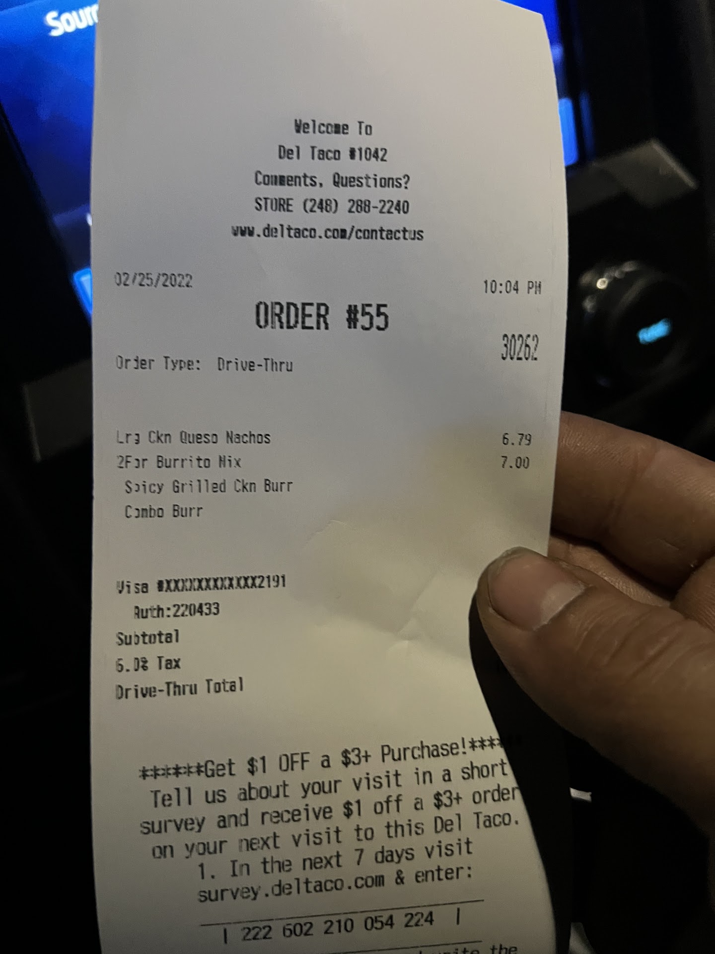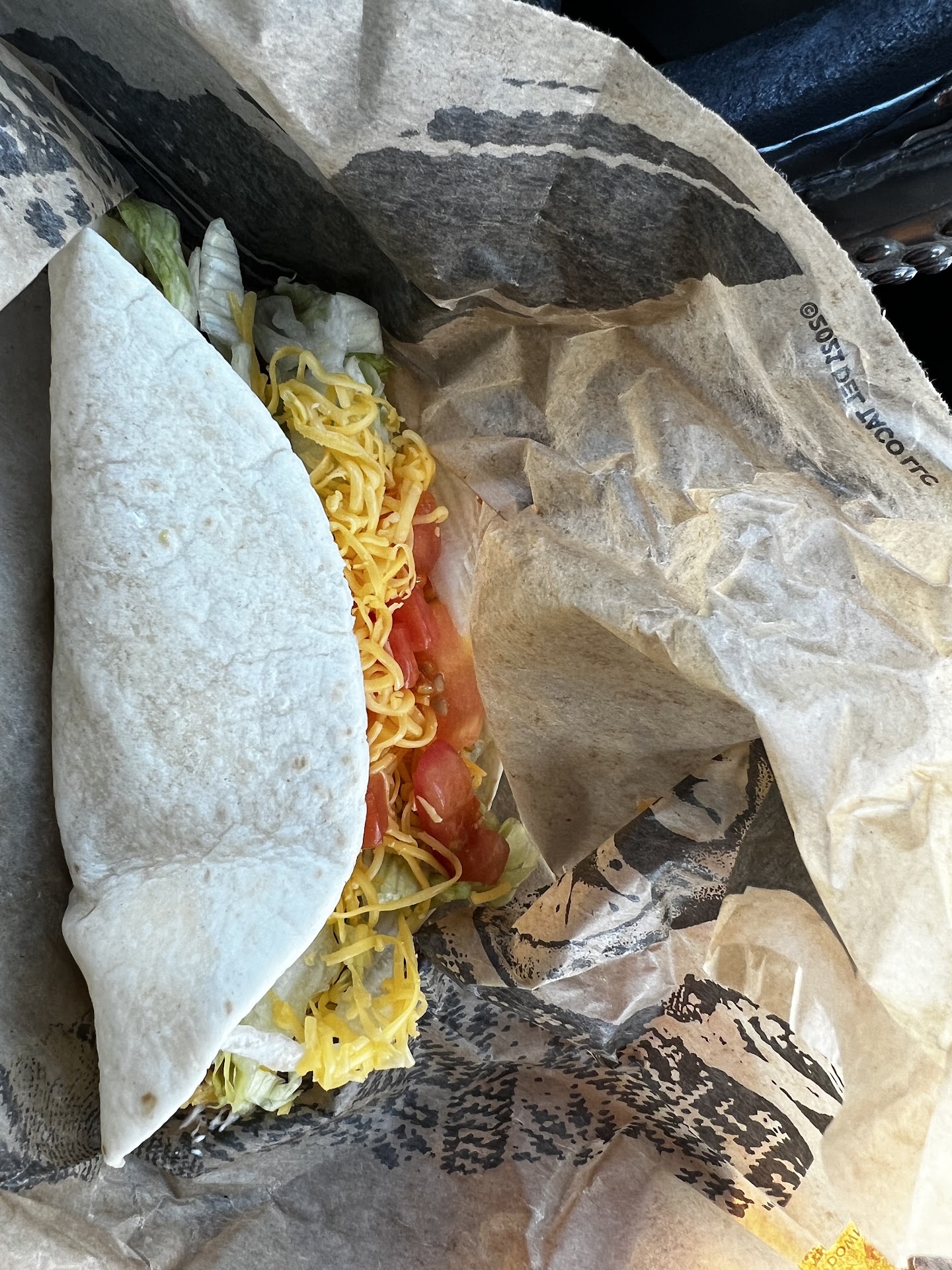 Read moreI order the Crunchtada on almost every visit, as it is in my favs list. I've never been asked (until today) if I'd like to add ground beef or sour cream. It's good to know I could if I wanted to. Crunchy tacos are full of ingredientes listed. Unlike Taco Bell which always has very little cheese, unripe tomatoes and no lettuce. Del tacos are packed full of all those things. I get the lil tacos off value menu but Tues I get the 2for$3 regular size tacos. I do like that the bean burritos do not have onions in them. Again Taco Bell adds red sauce that already has the onions in it. I add my own sauce and reclose it. The Cheesy nacho is good for what it is. Again, better than Taco Bell where they give you a 2oz cup of cheese that's gone in 5 chips w chips left over and now no cheese. I made a bet w my daughter's...I bought 2 crunchy tacos from both Taco Bell and Del Taco. Thier conclusión... the beef inside the TB was greasy as it dripped down our arms while eating it. There was very little lettuce, tomatoe and cheese. Also, later you do not get indigestión from Del Taco. Test it yourself! I will take pictures next time as we plan on another -vs- w...