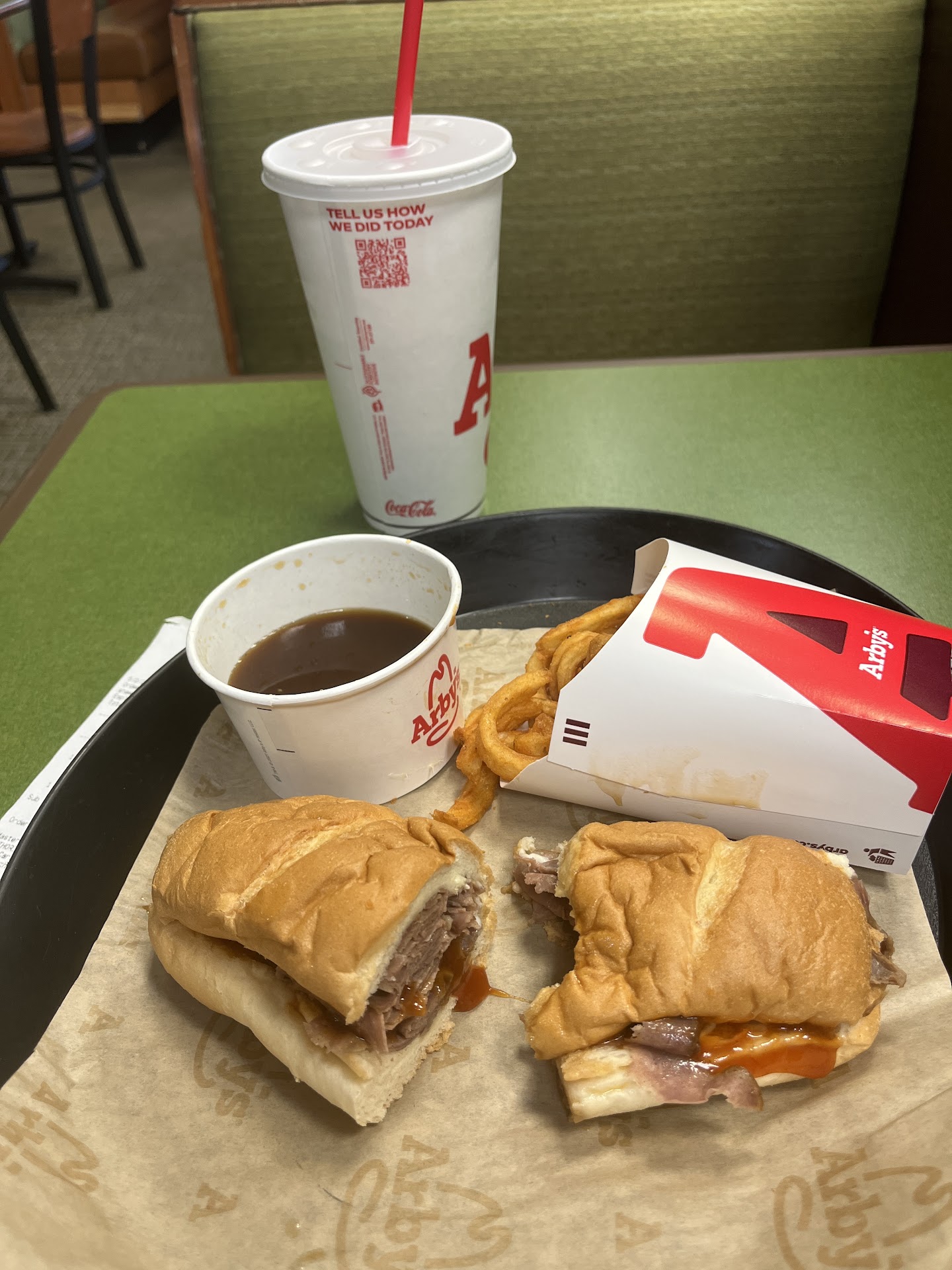 Restaurant was empty inside. When we entered the restaurant there was an employee standing just outside the door on her cell phone b!tching out someone about something that I really didn’t need to hear about. When we walked in there was no one at the counter to greet us initially and then this person came out and we mentioned about the girl outside on the phone and they bolted out the door after her. Eventually someone came and asked if they could take our order. I asked a few questions about the fish sandwiches and the guy really didn’t make much of an effort to try and sell me on one or another. I had to ask specific questions about each one about the sauce and if it had cheese. It was like pulling hens teeth. I did select the Hawaiian version which has a sauce, lettuce and was supposed to have cheese. Mine had no cheese and when I asked the manager about it he argued that he knows that he put cheese on my sandwich. I was afraid to ask them to make me a new sandwich for fear of what they might do to my food. Plus I had already waited over 15 minutes to get the food we got. As soon as we placed the order the employee put our curly fries on the serving tray and it took them 15 minutes to incorrectly make our sandwiches. Needless to say the fries were not hot at all. Oh and the girl who was outside the restaurant when we were walking in was texting on her phone the entire time she was quite slowly preparing food behind the counter. I’m surprised she didn’t drop her phone into the deep fryer as she was sorting the food from the fryer baskets. I always thought this Arby’s served a nice hot meal and I would truly enjoy ringing the bell on the way out the door. Not this time and I doubt I will ever step foot in this Arby’s again. I’ll head down to Prices...