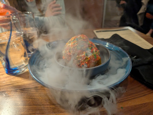 Lastly, my wife saw the ice cream come out with the dry ice feature to the bowl. So naturally we had to order that as well. The ice cream was good, but the fruity pebble topping seemed a bit stale after it was fried. It wasn't crunchy, but more of a stale type chewy. I was not a fan of that texture, but we definitely finished it.