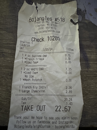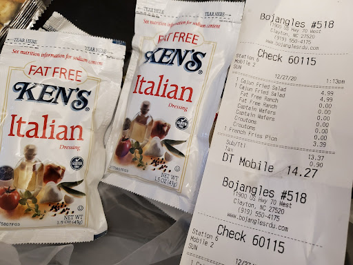 Read moreI have been going to this Bojangles for the last 20 years. they used to be very good, but over the last 3 years the quality of the service and food has suffered. last saturday we went there, ordered a family variety feast . First issue was the cashier who you could barely hear and then her english was so bad she needed a translator, then the manager or someone acting like a boss couldnt answer a question about paying extra to exchange 2 chicken thighs for 2 breasts . she said we never do that even though we have usually paid a surcharge for it in the store and its also on grubhub which we order from too. we gey home and the 2 fries are cold and have no flavor. luckily we have a microwave and buy the bojangles seasoning online . but then the mac and cheese had no flavor, the chicken tenders were overcooked and the regular chicken was undercooked and again no seasoning. the tea was good, but they need to hire some older people who know what they are doing before the ones there end up running all the customers away. we had stopped ordering bojangles from grubhub awhile back because the store would leave out food and they do it in person too but at least we could check the order before we left, but just too many times having to drive back there to get what they left out and now this visit was the nail in the coffin, fast food places need to understand there are many other places local that sell chicken and provide a hell of a lot...