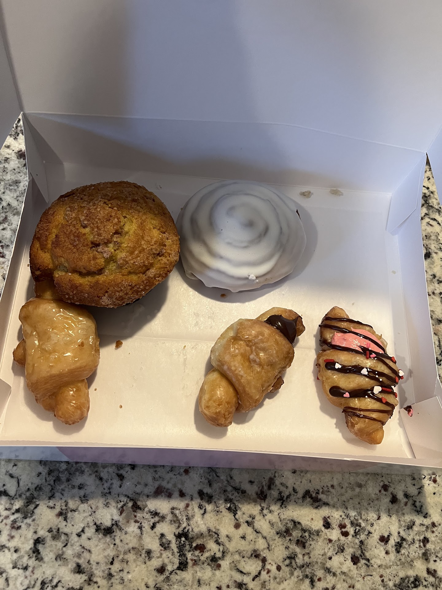 Read moreThis was an absolutely wonderful treat! We just happened to see if there was a bakery in the area and stopped into this one and it was packed. There is a reason it was packed, it was fantastic! Their filled and topped croissants offered something that was not over the top sweet but was a nice mix and they were so imaginative! One daughter got the banana pudding filled croissant and the other got death by chocolate. I ate a blondie but it was so rich I could only eat half and again, amazing. I highly recommend that you stop in for a treat. In the picture you'll find the Bavarian cream filled croissant we got to go. My kids wouldn't allow me to take pictures of the other ones because they wanted to devour them...