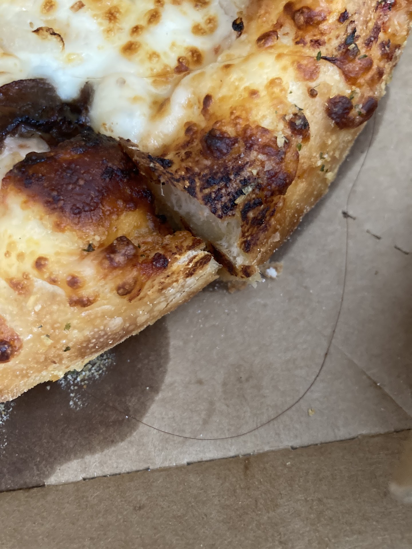 The pizza was burned. I attributed that to the fact that it was a thin crust pizza. It was also stone cold when it arrived. Again, I guess I should expect that when a pizza is delivered. However, when we went to reheat it I found a hair attached to the bacon and cheese.