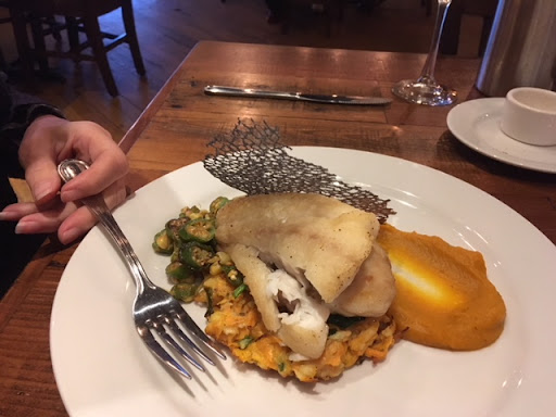 Our entrees were the burger and the meatloaf. We chose brussel sprouts, collard greens, and potato salad as our sides. The food was delicious and well-prepared. Both of us are looking forward to going back for dinner. I will say this about the burger, I feel that just like the crab dip it needs another taste dimension, preferably some type of sweet jam, such as a blackberry jam to add a note of sweetness.