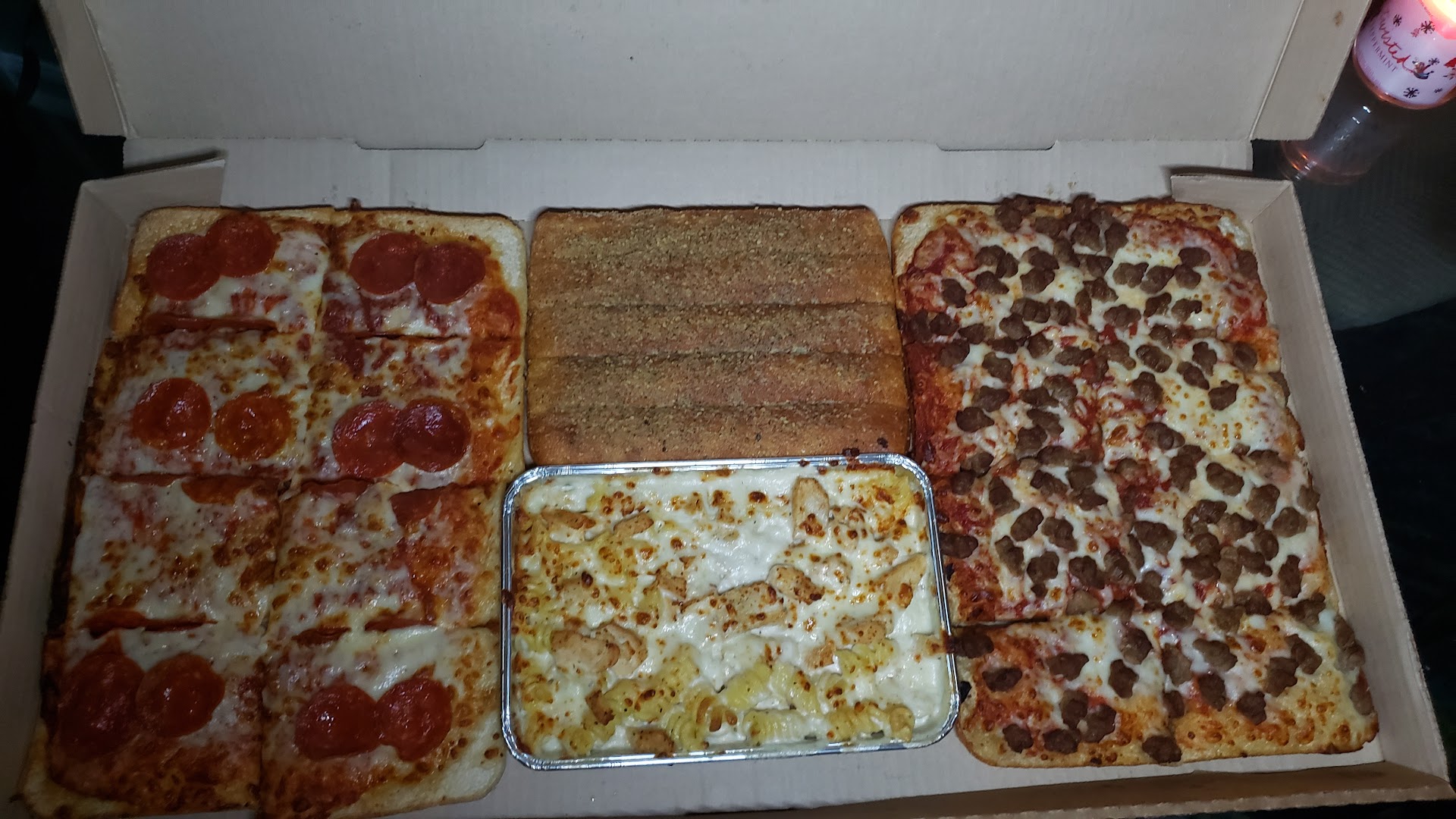 2nd; the persons in charge of making the pizzas are apparently not familiar with their toppings and the pizzas they go on. We had a Super Supreme and a pepperoni. The Suoer Supreme should come with more than red onions, black olives, back bacon, sausage and green peppers.