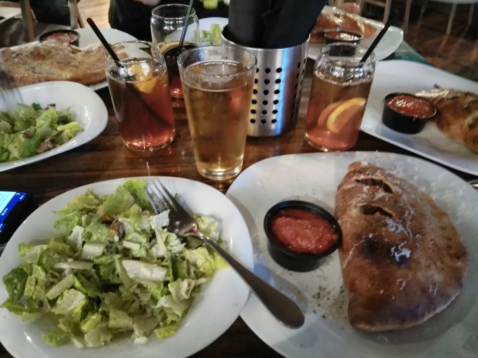 But since I was having a cheat day, I figured I might as well have a few bites of the savory calzone my hubby ordered. The Gonzo - salami, dates, spinach, Boursin, mozzarella, marscapone, ricotta and garlic oil inside, served with a side of garlic butter. I thought this sounded pretty friggin' awesome and unlike any calzone I've ever heard of. I don't know where else you'd find a calzone filled with dates! Despite the fact that all of the dates seemed to be stuck in the corners while the meat was piled high in the middle, this was a pretty delicious calzone!