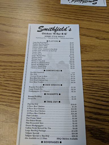 Read moreMy family and I decided to come dine in the other night and I had the worst experience ever!! It was almost 9pm, no one was dining in just a few cars at the drive-through, we waited there at the counter 10 minutes or more and even tho the workers there were inform of us, they never greeted us, didn’t try to take our order, they didn’t even came near the register. After us waiting all that time, I ask “excuse me, is there anyone taking orders “ one replies “ we are busy with some orders”. Did not apologize and not even then tried to serve us. This is unacceptable!! Every business should be very professional and have if not excelente customer service, but at least some good customer service. I don’t want to think that but it all takes me to thing this was a racial attitude since we are Hispanic, I don’t see any other reason for not even wanting to greet us nor serve us. We were very disappointed because I really wanted to recreate a memory from my childhood when I first tried Smithfield’s chicken and barbecue because I haven’t been there since I was 9 and I’m now 39. We were...