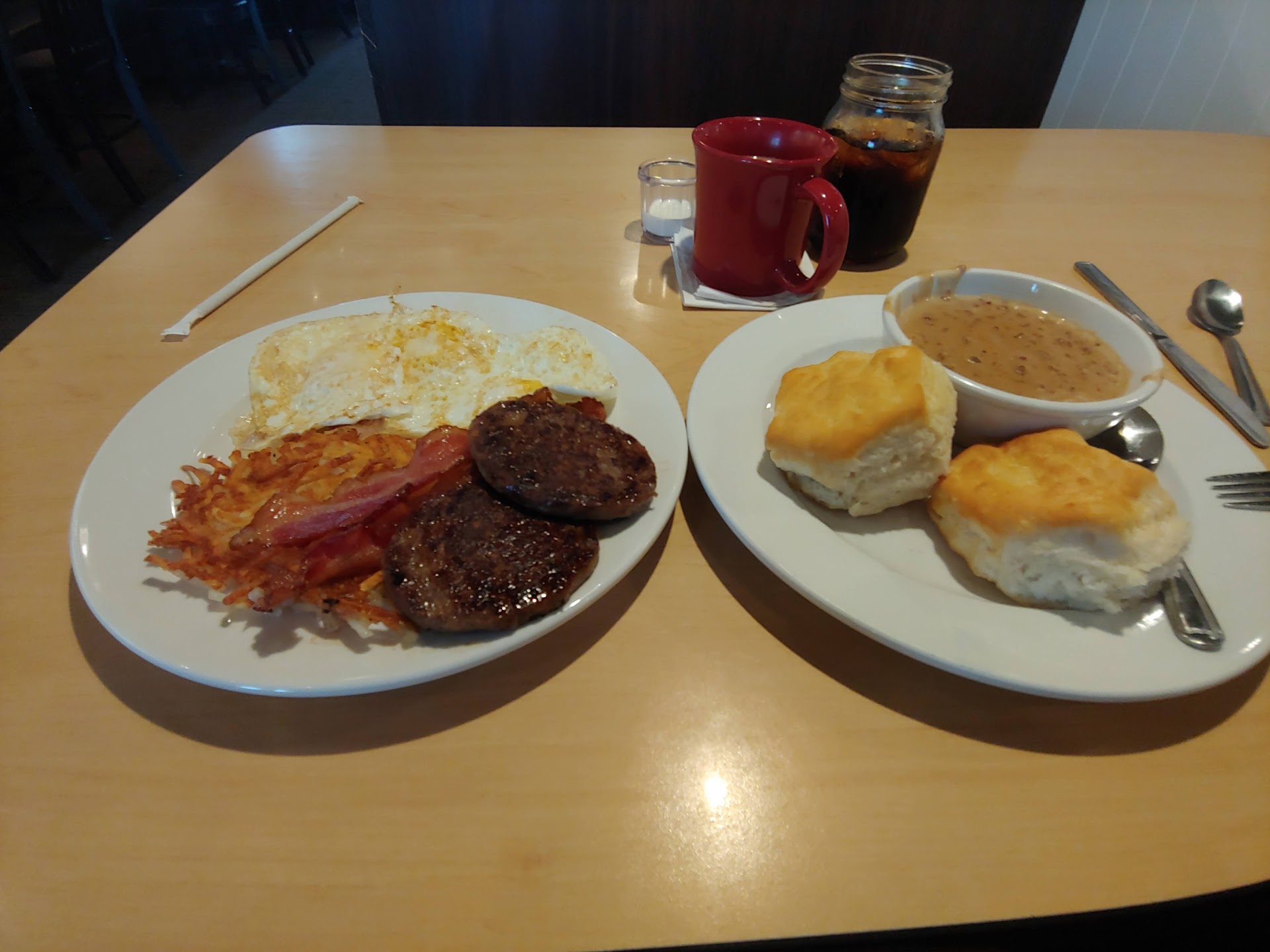 Went in for breakfast on Sunday morning with my wife. Place was a little busy but we got seated in a couple minutes of arriving. No one came to table to acknowledge us for about 10 minutes, then the girl who seated us stopped and asked if anyone had been there and offered to get us drinks. After she brought drinks she said our waitress would be right there. Another 10 minutes go by and waitress stops and said she'd be right with us. She just kept walking by us serving her other tables and never came back. Another waitress came by about 10 minutes later and said she was going to take our order because our waitress was too busy. We only ordered sausage gravy and biscuits because at this point we have been sitting here for 30 minutes or so and the place has been getting packed since we sat down and we are now behind everyone elses order. Knowing that the waitress dishes out the sausage and gravy and doesn't have to wait for the cooks to do it we figured we get that quicker. WRONG, she totally ignores us until she hears us complaining then says she get our order right now. DIDN'T HAPPEN, she continues to wait on others until we are about to get up and leave. Its 50 minutes now and she finally realizes she forgot us and brought the food. I can't imagine treating regular customers like this and without a sincere apology from the manager to boot. The manager knew what was going on and did nothing about it. We'll never return to this location...