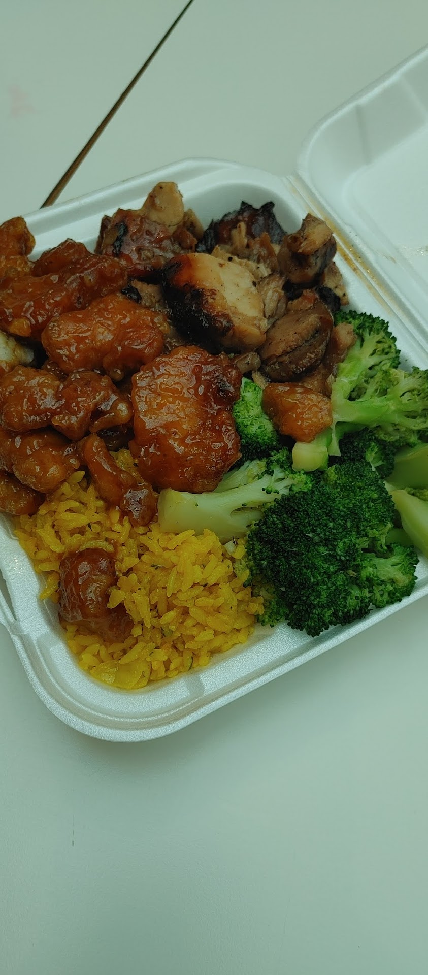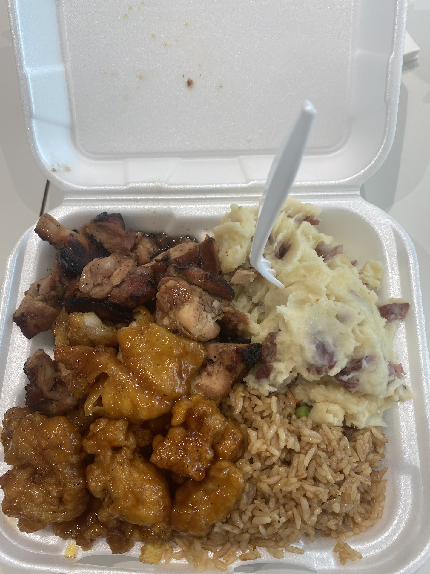 Ate here about a week ago. Read some really good reviews and decided to try it. I love the set up they have. Its like Subway where you can see everything, and pick what you'd like from what's there. I got the 2 entree 2 sides meal for $14. I chose the sticky/glazed chicken (cant remember what it was called exactly), grilled bourbon chicken, yellow rice, and jambalaya pasta. Thr sticky/glazed chicken was my favorite! It was sweet and just so yummy. The grilled bourbon chicken isn't something I'd had before and isn't something I would normally try, but they were handing out samples and it was really good. Moist and flavorful. The yellow rice had bits of chopped up onion in it which was fantastic. The jambalaya pasta was pretty much just spaghetti with red sauce, green bell peppers, and onions. I make something similar to it at home. Very good and was instantly my toddlers favorite. Portions were crazy huge. Picture is from after me and my 3 year old finished eating. We will definitely be back! Been thinking about...