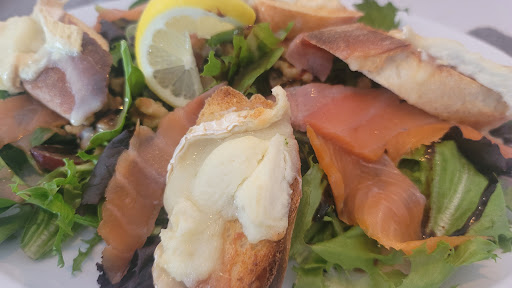 Read moreJust ate there for the first time to buy Mom a late breakfast and it was all delicious. I had the Salmon with Brie omelette and a cafe macchiato. Both were all I could ask for. Mom had some scrambled eggs and a side (see pic) The omelet had a nice buttery flavor like when I make mine at home with ghee. I'm not much for carbs these days so it was great to see I could have a salad with my eggs, and was very happy taste the salad. This was a real (, mixed greens salad (not one of those tiny, pale iceburg afterthoughts) with a light balsamic dressing that was perfectly balanced according to my taste buds. It was breakfast so I had the obligatory side of bacon, which was lightly crisped, just the way I like it. Let's talk coffee. I'm half Swedish thanks to Mom so our DNA asks for a nice dark, European coffee. Jerome's Columbian espresso was deliciously potent and one shot was all I needed. The cream of the macchiato smoothed it out wonderfully and I was a happy man! So, all in all, it was the perfect breakfast. Be advised: Flying with Jerome seats about 50 people and it's not uncommon for them to get very busy, serving as many as 250 on their busiest weekend days. I recommend getting there before 10am on the weekend and before 11 on weekdays, from what I learned talking to Jerome for a few moments. In any case, we'll definitely be back and I plan to bring friends soon...