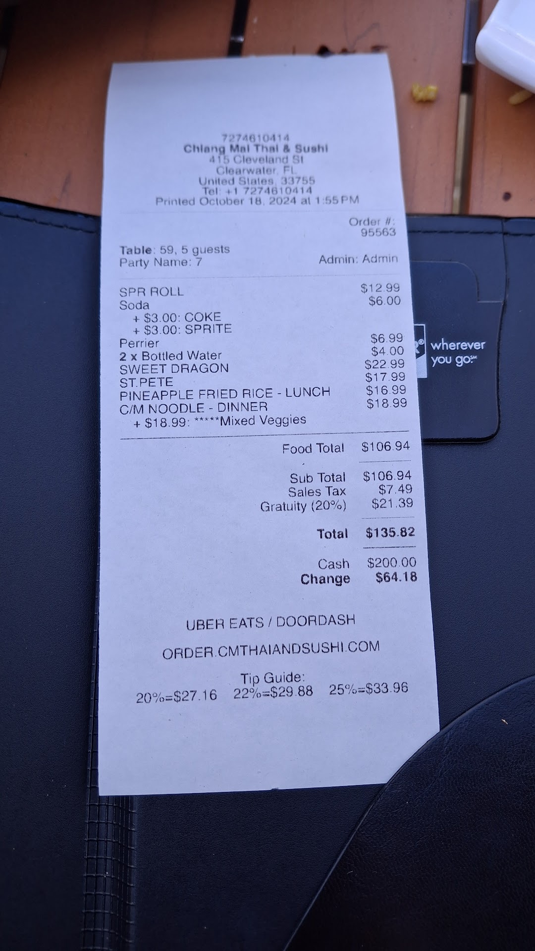 Read more3 adults/ 2 kids. Went inside to ask for a table and it smells terrible in there (like an old moldy place) so we decided to sit outside. The spring rolls are miserable and expensive. Order two sushi rolls, one was supposed to have spicy mayo which it didn't, so ask the server if she could bring me some spicy mayo, she said ok i will add it to the order, i tell her that the roll was supposed to have spicy mayo and she insisted the opposite, so i ask for the menu to double check and indeed it was supposed to have spicy mayo. She starts arguing saying that they mix the salmon with the mayo blah blah and she goes inside. She comes out with this nasty orangy syicky sauce which i think it was duck sauce mixed with siracha. It was disgusting! Then i ask for a plate for my 2 year old and i specifically told her it was for her and she bring a glass plate, 2 minutes later my 2 year old accidentally dropped it and breaks, the server gave us the meanest look and goes inside. After we were done I asked for the check and I see she tried to charge me for the sauce, and she added the 20% for the tip. I ask her to please remove the sauce and the 20% tip because I did not wanted to tip that amount. She said it was mandatory for a party of 5 which again it was only 3 a adults. The kids didn't even eat! She also said oh the owner said this time he won't charge you for the broken plate but next time he will. I laugh and said there is no next time. Thanks. This place...