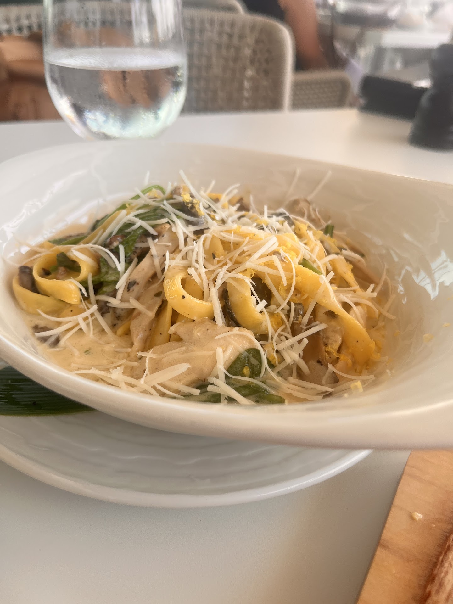 The standout dish for me might’ve been the chicken tagliatelle with butter-poached mushrooms. The sauce was rich but not heavy, and the mushrooms added an earthy depth that worked really well with the pasta. We appreciated being able to order a half portion — just the right size to enjoy without overdoing it.