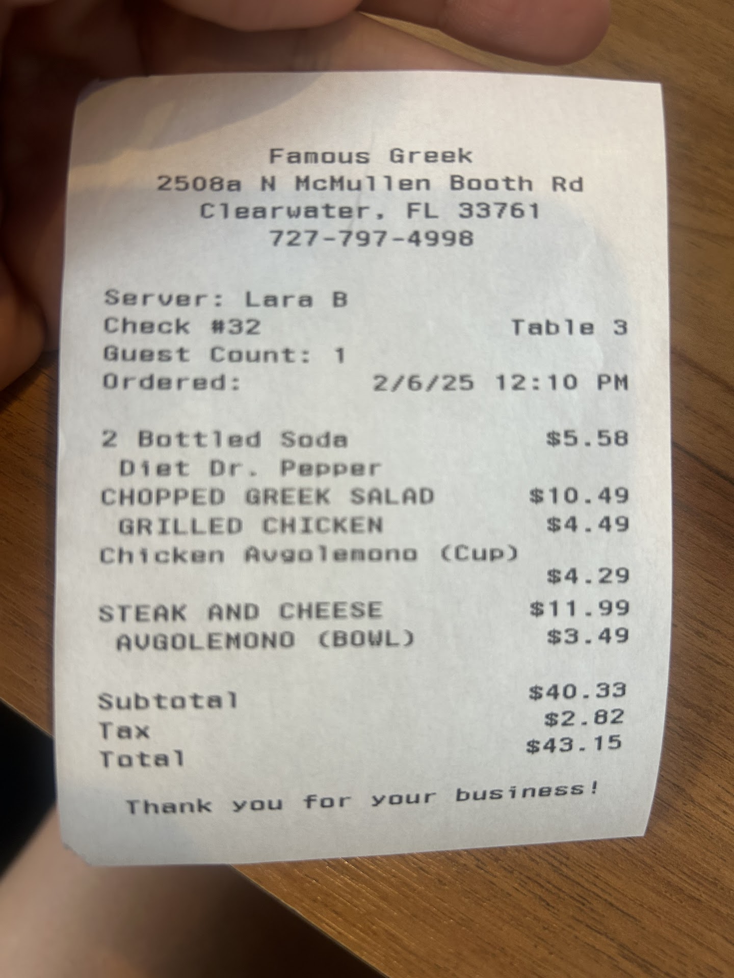 Read moreThis place is Amazing. We have been customers since we moved here four (4) years ago. The only thing that was bad was the salmon. It was over cooked. I like mine RARE. Other than that, l just don't order the salmon because EVERYTHING ELSE IS OFF THE OPTIMUM CHART. I MEAN OPTIMUM !!!! Check me out as a food critic. I am one of the Top critics in the U.S.A. and l am telling you that the Famous Greek on Enterprise Road is totally Awesome. Prices are very reasonable. So reasonable that l don't even ask what the bill is. I eventually receive my debit card statement and that is soon enough. L0L. Save room for desert. The owner makes these coconut chocolate chip Macaroon cookies from scratch daily that are to die for. I take them home for my wife, who is the most difficult, fussy person who knows her deserts - - - She sez they are to die for !! I buy extra and stick them in my freezer. They freeze and thaw nicely. There is nothing you'll buy at the Famous Greek that you will NOT be satisified with. You have my word. Just the salmon and that is just a matter of personal preference. My wife orders the salmon all the time. Remember we have been going there over four years now. And again the prices are very reasonable. And the portion sizes are like any Greek Restaurant. Large !!!!! They love kids too ! It's small. It's quaint AND...