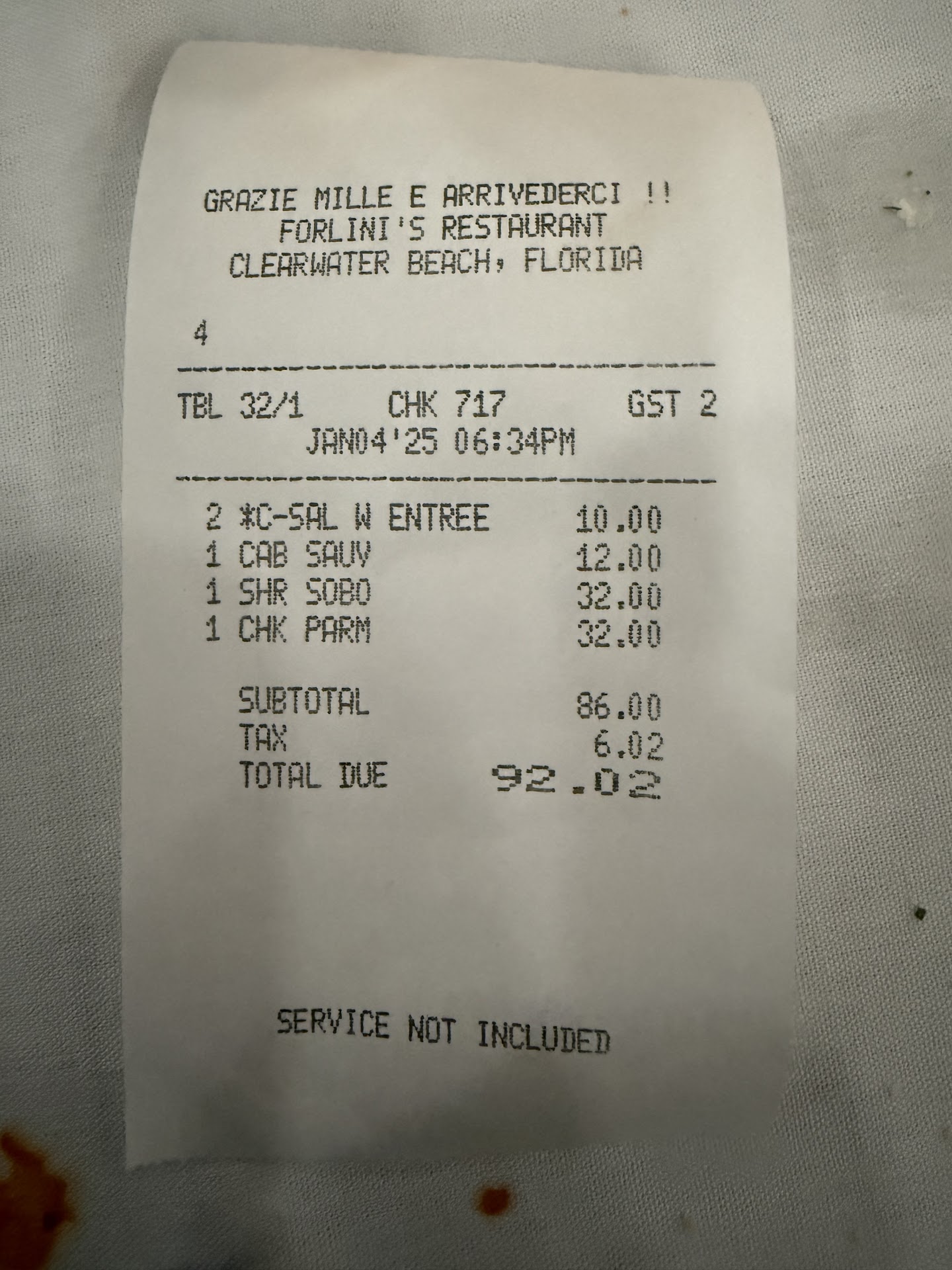 My family and I were visiting Clearwater beach from out of state. We felt like try Italian food since my husbands family is half Italian. We were also celebrating my parents 32 years anniversary and our friends 16 year anniversary. I called the restaurant and made reservations for 6 people. We arrived at the restaurant and were seated pretty quickly. Everything was going well until our orders arrived. The waiter had the unfortunate accident, spilling some hot lamb chops sauce over my mother’s head/ hair and arm because he was reaching over her head to give my husband the plate, which wasn’t even his order. The waiter saw what happen because my mom started to clean her arm with napkin towel. The waiter kept serving, reached over her head for the SECOND time to give the plate to my father. The waiter barley apologized and finished what he was doing and left.