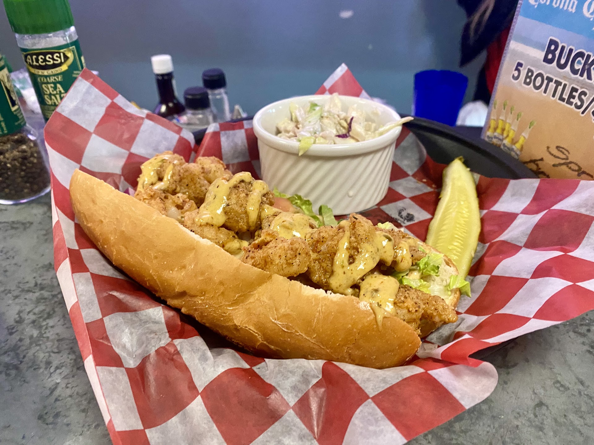 Food- Started with the Mahi bites. Came in a quick fashion. Were slightly under cooked and needed more seasoning. Tartar sauce helped with flavor. Ordered the Po Boy with coleslaw and the POKE nachos. Sandwich and nachos were very good flavor and really enjoyed them both. The coleslaw might have been the worst that I have ever had. It was a bad combination of chopped up leftover lettuce, a little cabbage and a cream sauce with little to no seasoning. I tried to add S&P, but didn't help.