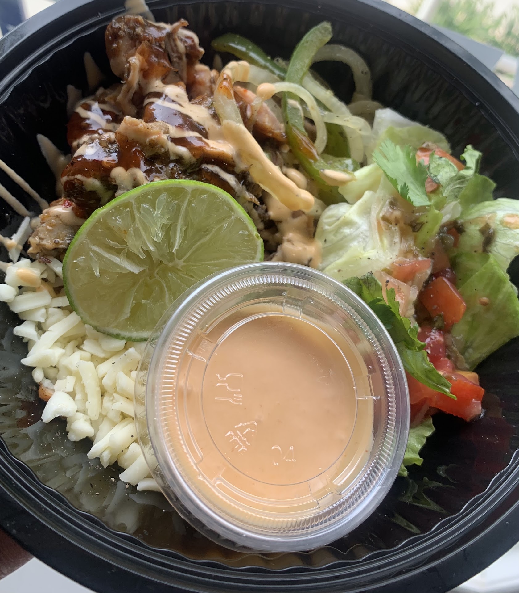 My man got her loaded jerk chicken cheeses fries with queso, juicy chicken, and salsa topped with spicy sour cream. He loved it and I totally stole some, The fries were seasoned perfectly Also we got the jerk chicken bowl thatās what brought me in! Soooo yummy š¤¤
