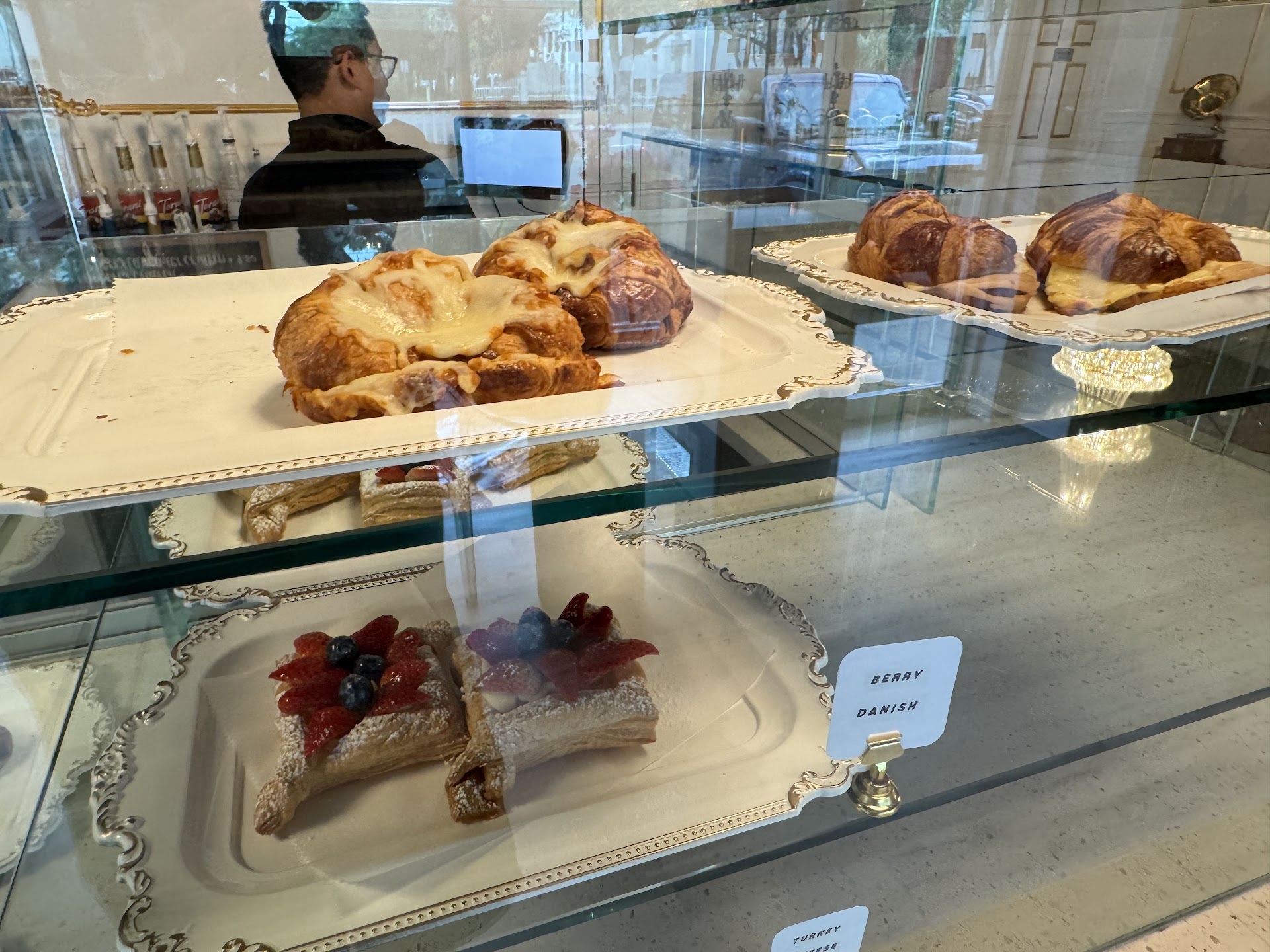 There was one gentleman in front of us picking up a to go order. We arrived to see a beautiful display case largely empty. There were no signs that they were cleaned out between their opening time of 6:30am and when we arrived at 8:00am on a Friday. It took about 10 minutes to place our order and 25 minutes to receive our turkey and cheese croissant, a pair of strawberry and crème croissants (a pistachio croissant wasn’t available,) a Coke (requested twice) and a (luke warm) hot chocolate. The young man attempting to be a Barista could have definitely stood some support from one of the two in the back or a seemingly absentee owner / manager. As others have stated it is slightly spendy given the strawberry crème croissant is $8.40. However, it is not radically different than their competitor at Indian Rocks that we ironically were at the day before. In the hour we were there we watched two different patrons leave as they could not be waited on timely. As we were leaving at 9am a young lady clad with a scarf arrived. She carried herself like a manager or perhaps an owner. (If she is a manager and / or owner, why wasn’t she there at 6:30 supporting the staff and the needs of the consumer?) Hopefully, they overcome these growing pains and meet the demands of clients in a more timely fashion. It is a costly venture to get consumers through the door and it is tragic to see them vanish due to the management’s inability to staff the place for success. Hopefully, this isn’t their demise.