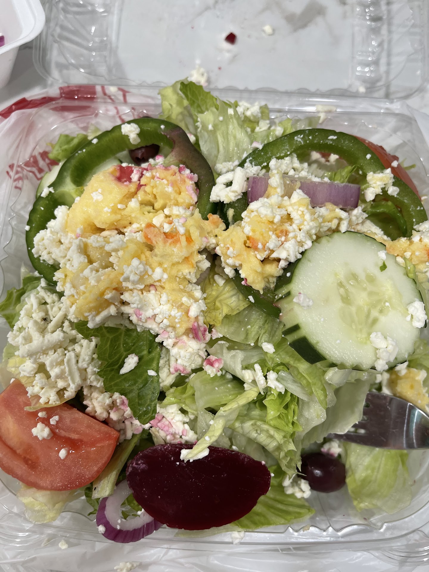 I was really looking forward to a delicious salad. The menu had cucumbers, red bell peppers, onions, olives, tomatoes, feta and potato salad listed. I chose to skip the potato salad this instant. I was presented with a plate piled high with gyro on top of my vegetables. At first I was impressed, then I side-plated my meat and saw my salad. Iceberg with a few pieces of romaine lettuce. ONE slice of cucumber, 1 slice of tomato, 1 extremely thin slice of red onion, 1 slice of green bell pepper, shredded mozzarella cheese, and 1 calamatta olive with a side of tzatziki and a side of Greek dressing. The menu was pluralizing the ingredients. Where's my red pepper? Where are my olives? Where's the feta cheese? I thought a quick order dine-in restaurant was going to surprise me. They ended up confusing me. $8 for lettuce? I paid extra for the meat and was served a more then fair portion. Next time I will grab a salad pack from Publix for $4 and get a much better salad to get my gyro meat dumped on.