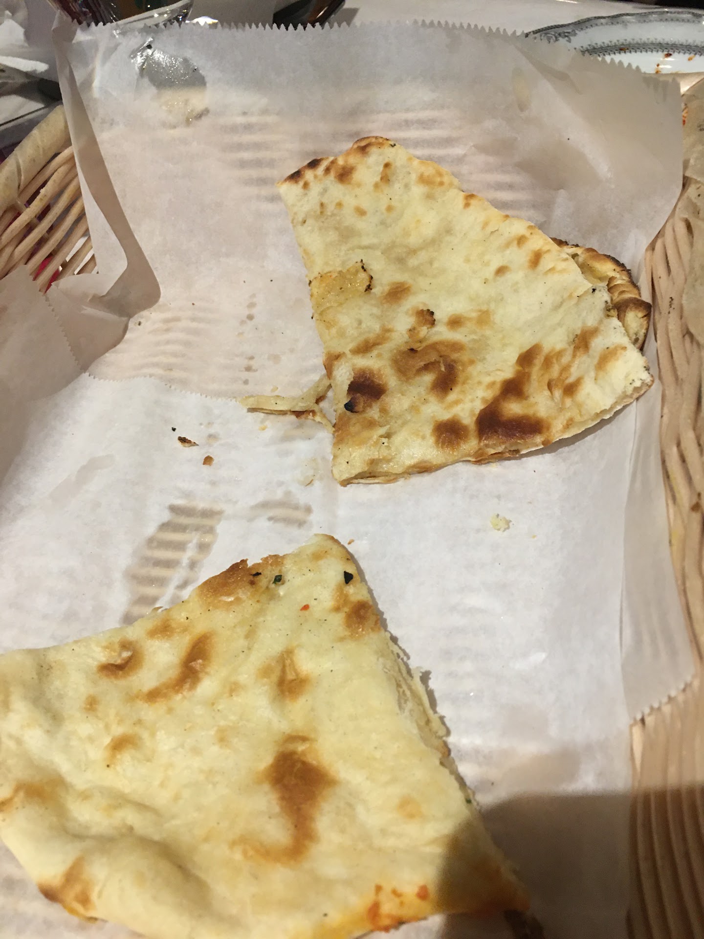 The lone naan that my husband took was inedible. It was (surprise) cold and so rubbery he could not cut it with his fork, nor with his knife, nor by tearing it with his hands. When he removed it from the pan it stuck to the parchment paper it was sitting on. Know why that happens? Because it was reheated. In a microwave