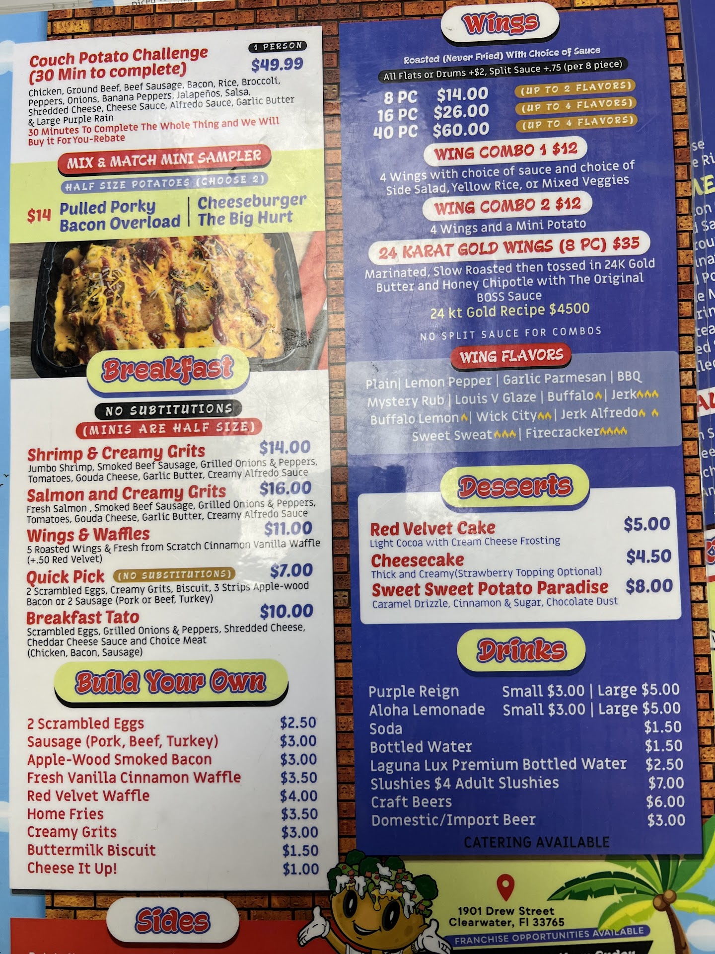 Read moreMy family came to town and wanted something to eat and I remembered finding this place as an alternative to another black owned business in St. Pete who only sells seafood baked potatoes on Tuesdays and Fridays. We looked them up and after seeing the wonderful ratings and beautiful pictures, I said hey, let's check them out! We came in to the establishment and immediately was welcomed by the lady behind the counter with a smile and a warm welcome. I JUST KNEW knew this was going to be a good first time experience! My nieces received their orders first and we looked at it and thought yeah, this was definitely a good idea! But after waiting an additional 20+ minutes for my order we inquired about the hold up. The woman who greeted us warmly realized that the young man, who was working diligently overlooked our order and became upset and started to complete our request herself. It was at this moment that I knew OUR food would not be made with the love my nieces food was made with. I am definitely going to try them again, but the first experience did not meet my expectations. I will update my review after my...