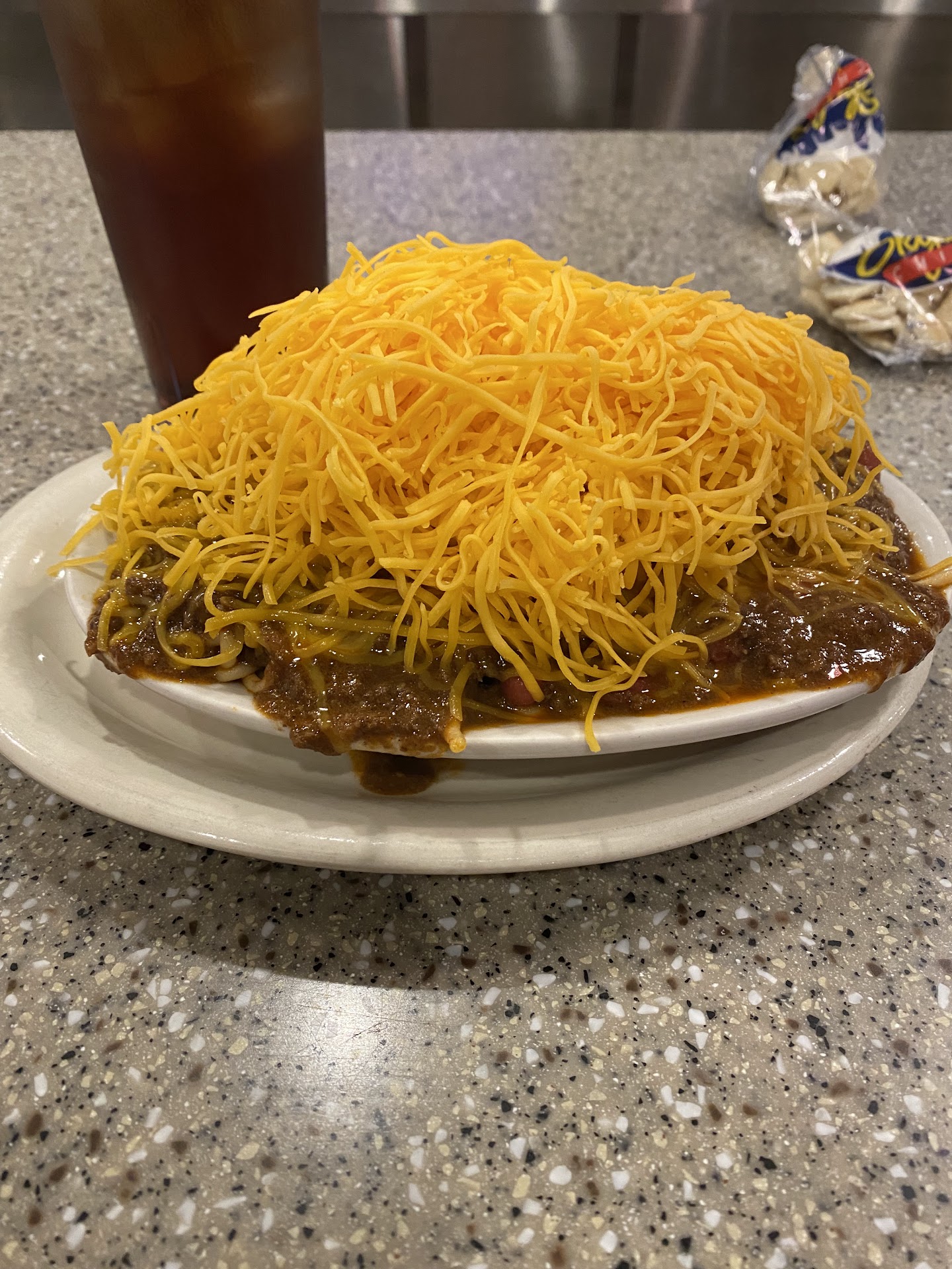 Our go to meal is cheese coneys (all the way), regular chili spaghetti, and cheese fries.