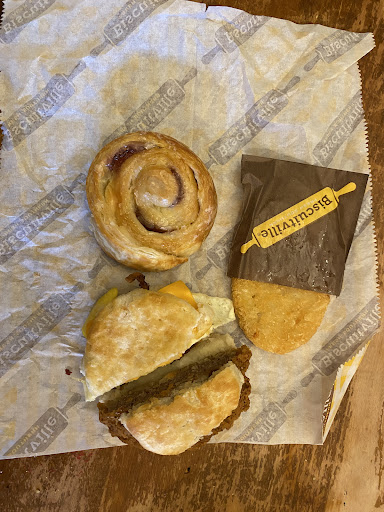 There was a line of cars wrapped around the building, through the parking lot, & all the way out into the road! In fact, my brother & I waited 10-15 minutes at 9:30AM before we received our food, but I actually enjoyed that wait since it was my first EVER trip to Biscuitville after passing it on the road several times. Waiting to see what everyone had lined up for hyped up the meal & we discussed the cool exterior design of the restaurant (the taped/panel windows, yellow painted barn-doors, etc. looked cool).