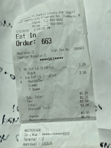 Read moreGave this place a second chance, wasn't worth it. I ordered a medium coffee with 2 cream and 1 splenda. When I got to the window, they handed me a coffee that had written on it they put 3 cream and 3 splenda in it. I handed it back to the lady and asked them to correct my order. She closed the window, spoke with the lady who took my order, then handed me back the same coffee. She stated that she accidently wrote the wrong thing on there but only put the 2 cream and 1 splenda in it. After driving away, already 5 minutes down the highway, I took a sip.... WAY too sweet and WAY too light. I called the store to have them refund my money. They said I would have to come into the location and they could make me another coffee. Told them this wasn't an option as I was driving to Greensboro and didn't have time to turn all the way around. I called again later this morning to talk to a manager, no one answered and I left a voicemail. I have yet to hear back.