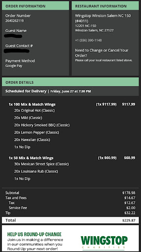 Read morePlaced $200.00 online order for party to be delivered at certain time, left $32.22 tip when ordered. Order was right at an hour late. Communication was poor when i called 2 times and Wing Stop told me to contact Door Dash about issue and refund. Wings were cold when they finally arrived. We ordered 6 flavors and the pans were not marked so it was a guessing game. The Door Dasher called me and asked me to come outside Food lion for some reason. I told him at was not at Food Lion.