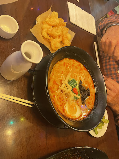 We started with the edamame -- and chose to add the garlic spicy sauce to it-- delish!! We then ordered the spicy shrimp ramen to share. It comes with popcorn shrimp on the side that you add in yourself. Ramen was great! Very flavorful and a big bowl. We also ordered the salmon crunch sushi burrito. It was okay. I didn't love the way they do their rice for it. I'm used to sushi burritos having more of a sticky rice to help hold it together. This didn't hold as well and seemed to have fried panko on the outside... not sure. It wasn't bad, but wasn't my fav. The flavors were pretty good though. And it's large and filling. We also ordered some hot house sake to share. It's the only affordable one on the menu, since they don't sell any by the shot.