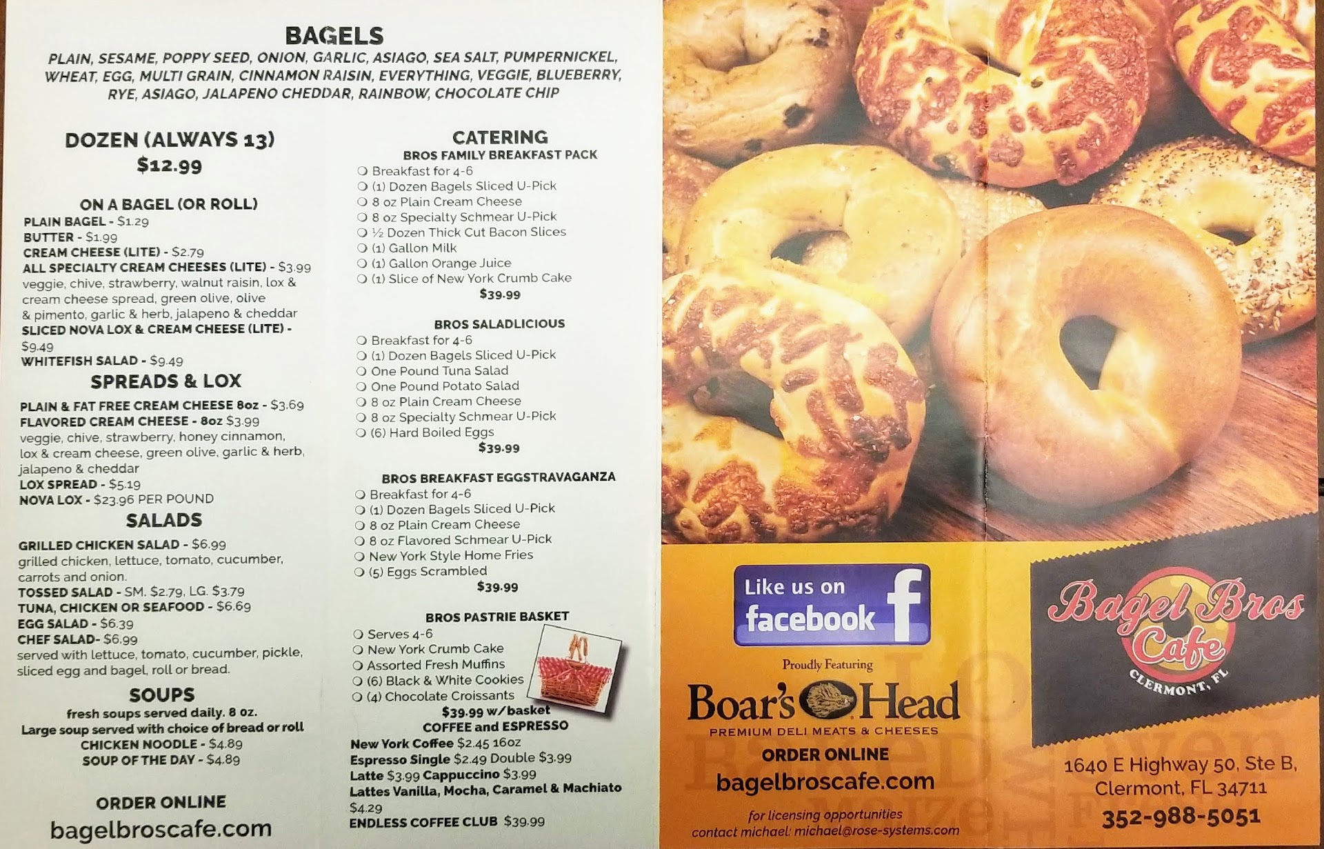 Ā Ā Ā Read moreBagel Bros cafe Clermont. Bad experience this morning, Iām not one to rant here as they say but I feel compelled. Went there this morning and while two people were helping 1 customer with her dozen bagel and pretty much in la la land whole one was filling up the counter with bagels, the person whom was doing that and help the other person asked me if I had ordered, I said no not yet. She then just went about doing something else. The guy that was assigned the other customer with the dozen bagels who clearly saw me standing there in front of the counter, once done with the customer asked another person who came after me if he had ordered already, he said yes and the. Helped him ahead of me, then when finished asked another person who also came after me and proceeded to help him. I said to him, hello⦠I have been standing here for a while. He went on to say, I thought you were just looking at the menu. I said yes but I was waiting for you to finish. He then said I should have Ben on the right of the counter. Im like so you donāt acknowledge customers in front of you if theyāre not on the right side of the counter? Wow. Bad bad service. Iāve been there a few times, but this was the last time. I had to walk out after that, I didnāt order. Shame on you how to take care of people coming in to support...