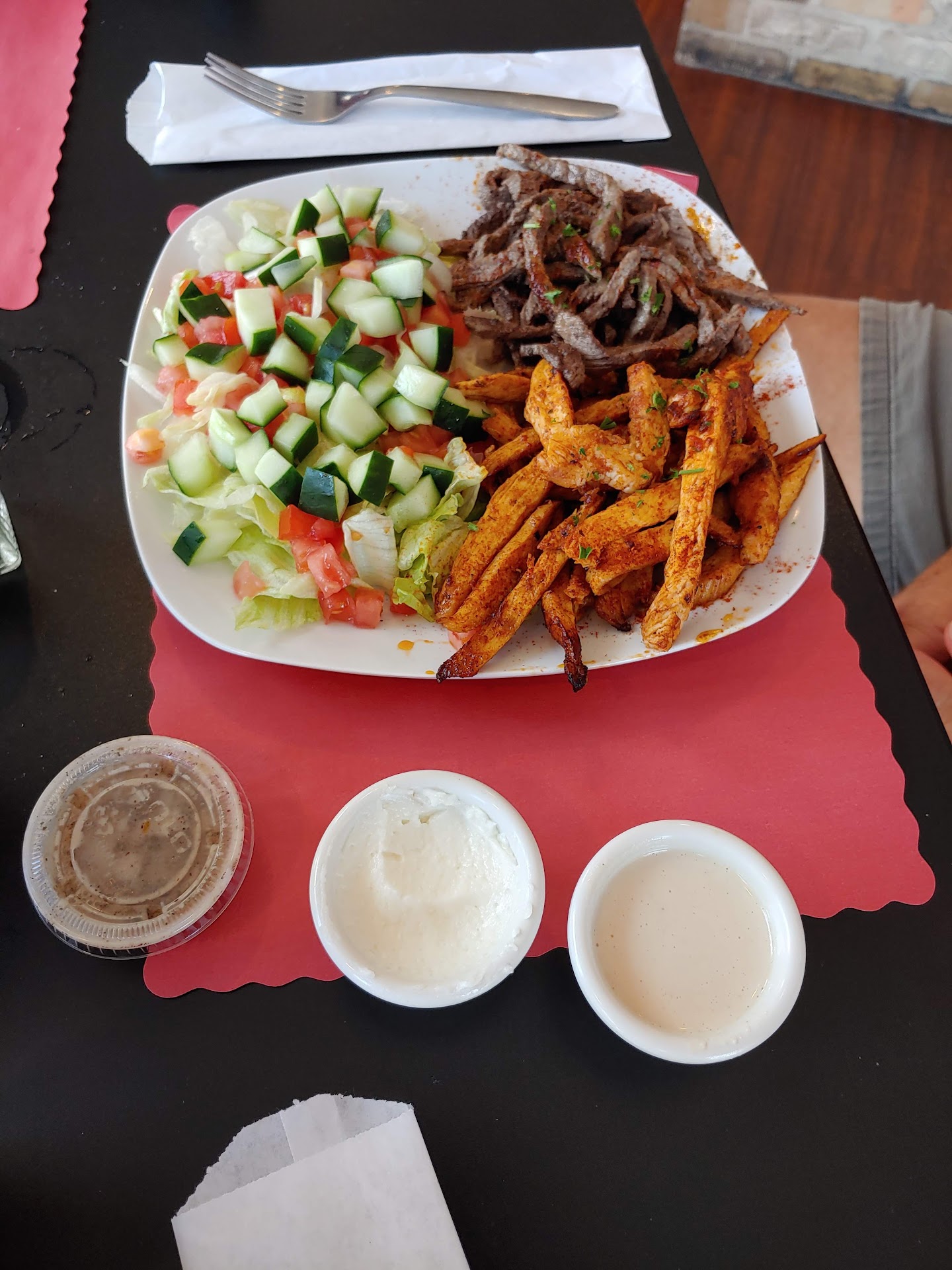 The food was less than mediocre!!! My salad had bitter parts of the lettuce that I had to pick out. My husband’s lentil soup was beyond bland and no amount of pepper or salt gave it much flavor. I ordered falafel and it was so over fried it broke apart and was absolutely flavorless and gritty. The gyro meat was flavorful but again over cooked and charred. The fries are about the only thing that was okay.