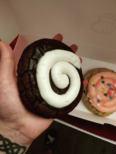I got 4 cookies. The first was a Swiss Cake Roll cookie: very rich, almost too chocolate-y. I couldn't eat the entire thing as I had intended- way too much sugar for me. It took me 3 days to consume it. It was delicious but I recommend sharing it with others. The second was a Boston Cream Pie cookie: Do not recommend. It is served chilled, which means that when it sits out for 10-15 minutes, it begins to sweat. The pie crust type cookie was soggy and the flavor was not great. It almost had an earthy, cardboard kind of taste to it. The ganache and Boston cream were delicious, however. They would taste great on a different type of cookie. The last two cookies I got were on a whim. I got two Frosted Confetti Cake cookies: The cookie looked pretty, and I LOVE Confetti Cake so I thought there was no way it wouldn't be delicious. I was wrong. The tablet that you order from in store did not list what was on the cookie- there was only a name. To my horror, I discovered it wasn't regular frosting or even buttercream, like all confetti cakes have always had. It was 🤢 CREAM CHEESE frosting. A sin, in my book. I felt so much disgust and betrayal when I touched the frosting to taste it on the ride home. When that sour-milk taste hit my tongue, I literally gagged. Unless you're a sadist, or hate yourself, I advise against this particular Confetti Cake cookie. Cream cheese has no business being on any or in any dessert. The cookie itself is phenomenal (yeah I scraped off the icing and tainted bits). It was overloaded with crunchy sprinkes which added a texture that I never knew I wanted in a cookie before. I found out from the Crumbl app's previous cookie flavor list that they have an unfrosted version of this cookie. I also learned that they use red heart-shaped sprinkles for Valentine's Day. I am excited to try those but I will not be getting that frosted one ever again. As far as "atmosphere" goes, it's a pink and white bakery with little to no decor. It's very basic and plain. There's full view of the ovens and cookies on trays, which was neat. It's really no different of a layout than going to Hungry Howie's or Papa John's to pick up a pizza you ordered. It's not a dine in kind of place. It is far cleaner and well maintained than a pizza delivery/pickup place though. The app is great to have if you want to check out the weekly menu, and find out which location has a mystery cookie flavor you've been...