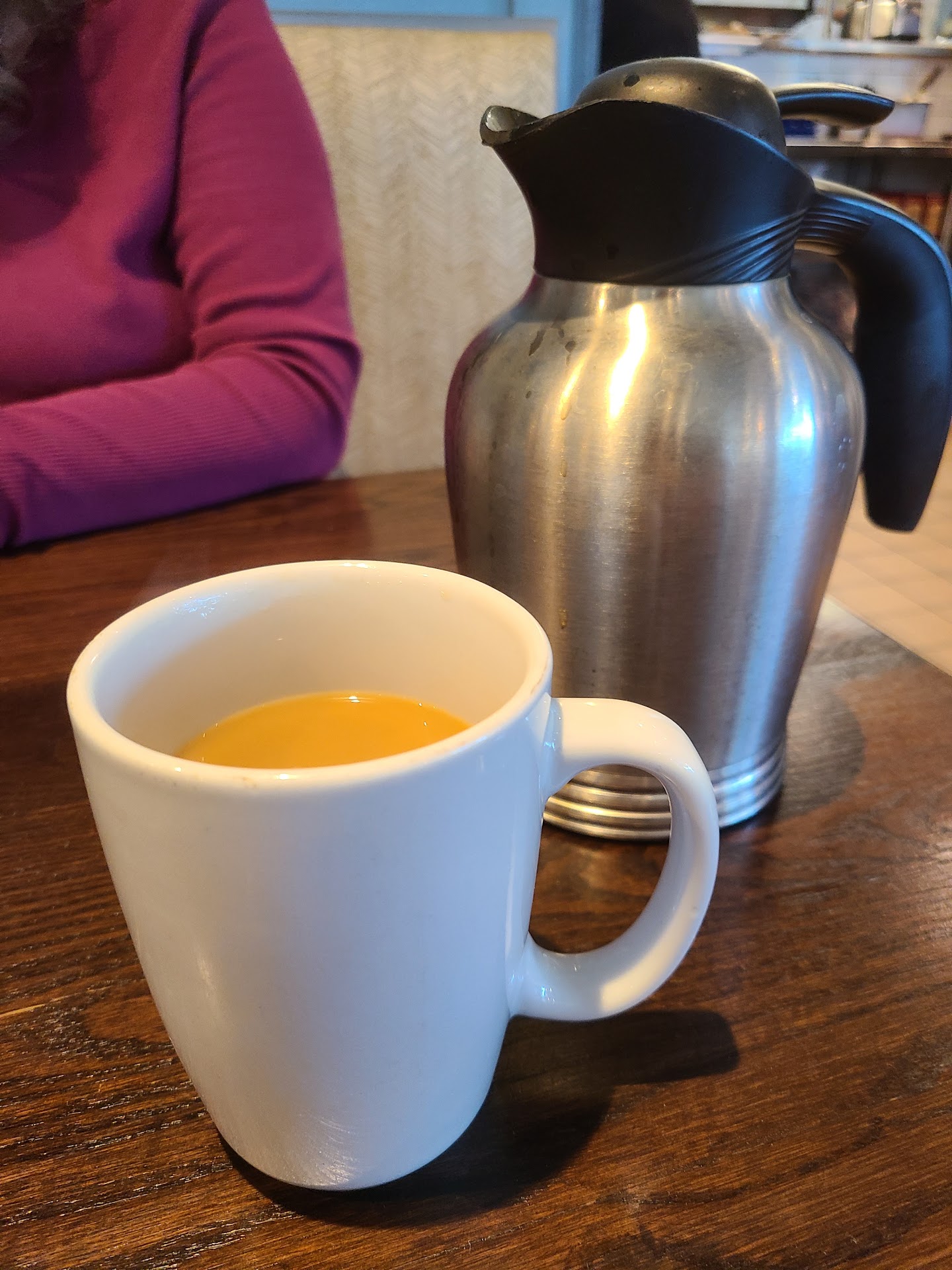 Our food arrived in a short time. While simple meals, the presentation was excellent. The breakfast burrito was covered with a hollandaise on one half and an el pastor sauce on the other half. On top was avocado covered by a pickled red onion rosette and topped with a light dusting of cojita cheese. I asked to hold the cilantro. As this burrito is served wet, it's easier to eat with a fork and knife.
