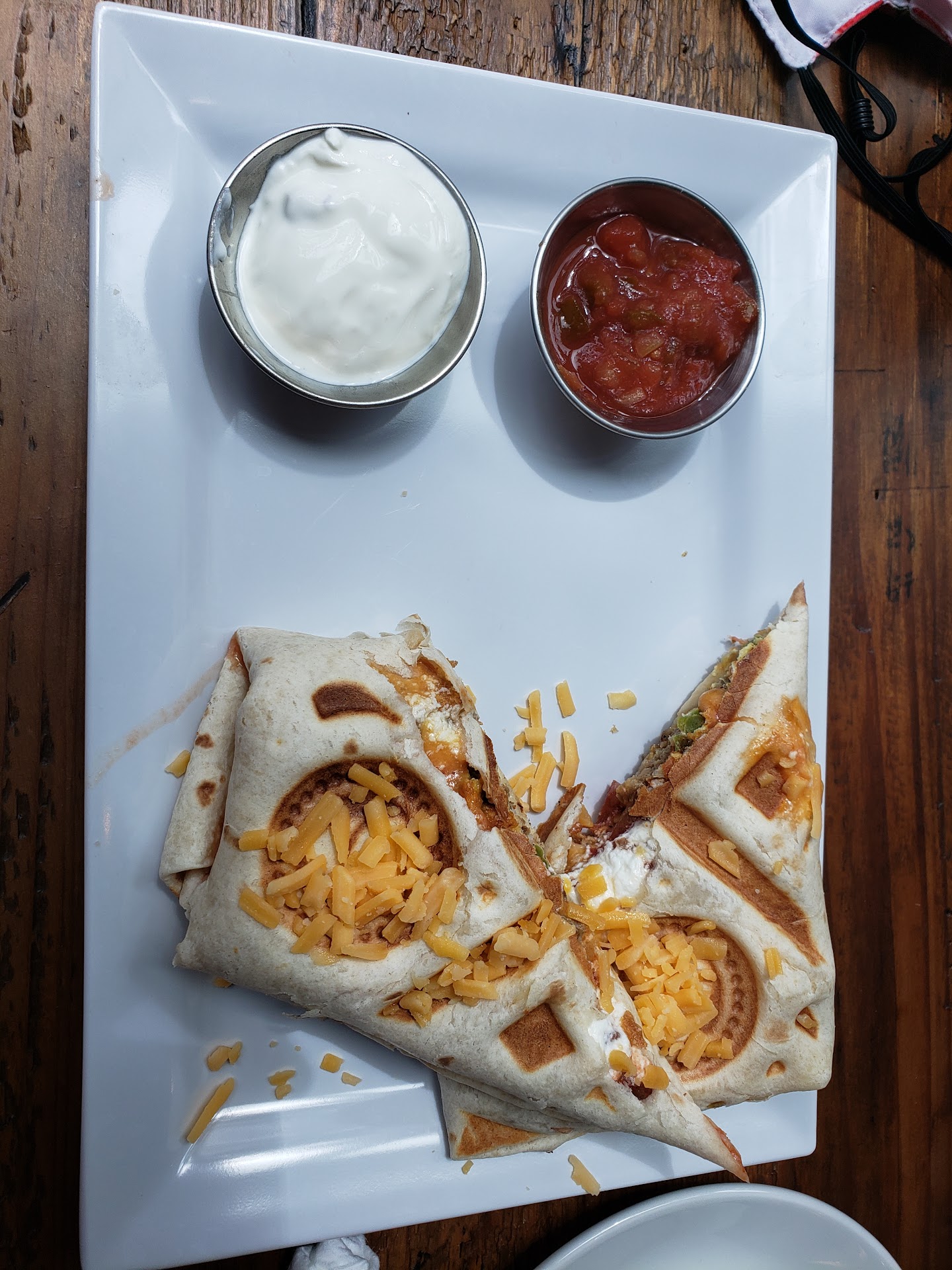 For brunch I had a breakfast burrito and it certainly wasn't what I expected. For one there wasn't much egg in it, but most notably it's not shaped like a burrito. It's pressed like a panini in a waffle iron and cross sectioned diagonally. That being said it was crunchy on the outside, and flavorful on the inside. Very tasty.