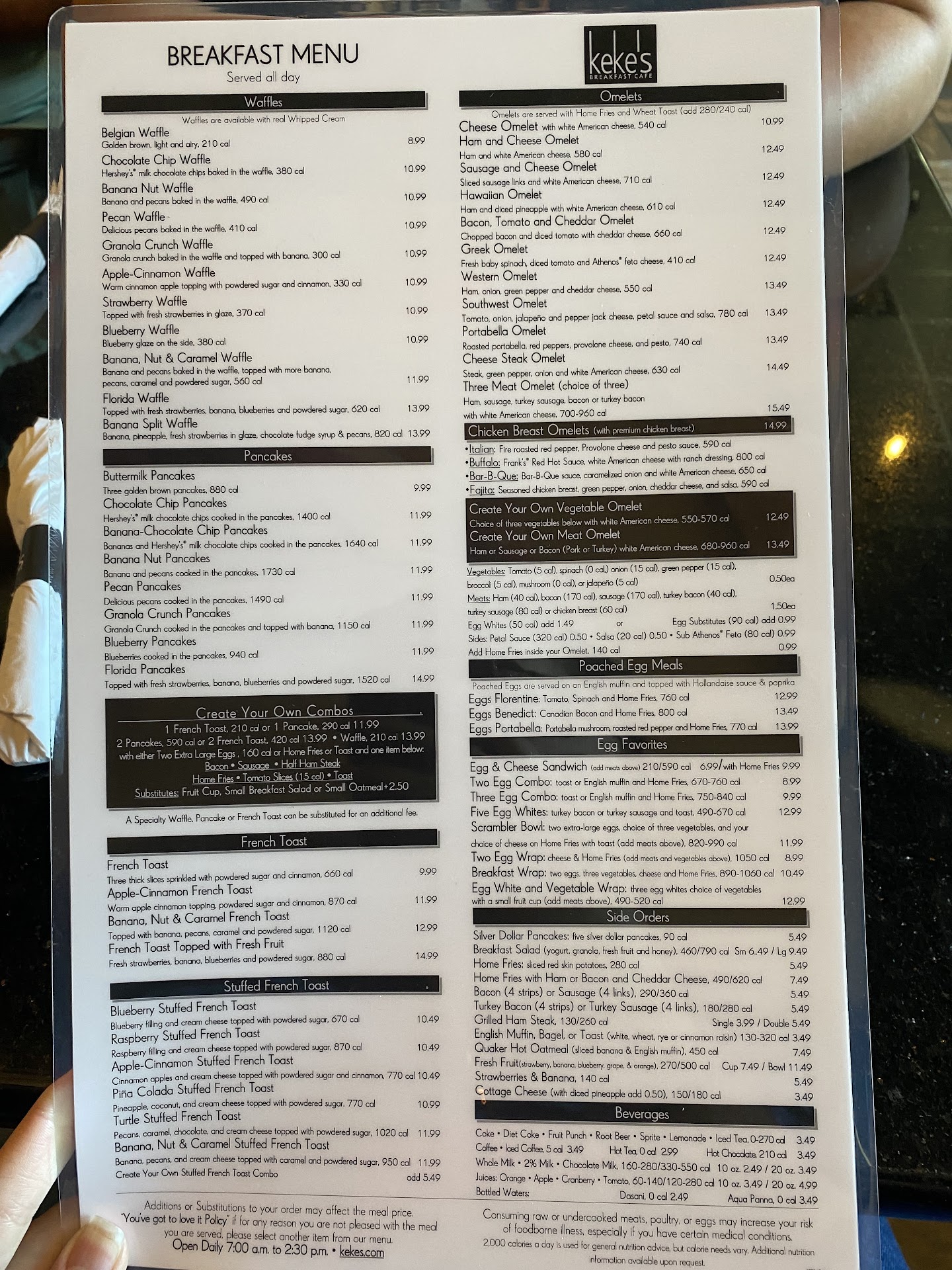 Members of our family and I flew here from New York and Connecticut for Walt Disney World and Universal Studios and so went to Kekeās on the recommendation of a fellow co-worker as a viable breakfast spot. However, since we didnāt get there until ten-thirty our party decided to change gears and order lunch instead of breakfast. That mightāve proved to be a mistake on our part. Being that I was in the mood for a hearty, juicy burger, I ordered a bacon cheeseburger thinking it to be a safe option. When doing so, I asked Allison our waitress to have it cooked medium-rare. I was then shocked when I learned that there was only one temp available and that was WELL DONE. Although I was upset by this, I went ahead and ordered my burger any way. I mean if I wanted my burger fully cooked then I could spend a lot less and go to a fast food restaurant instead right? Well after trying their burger, I wish I had, because the burger was smallāabout thirty-percent smaller than a Whopper. I asked for raw onions and I got diced onions which I found odd as Iām accustom to getting onions cut in ārings.ā Not sure if that is a Northeast thing for me or a time-saving thing for them but I thought it peculiar that they do it in that fashion. The other thing is that their menu offered half-pound burgers which I was at first impressed by. There was some confusion over this because when Allison asked if I wanted a ādouble burgerā I declined, thinking she was offering me two half-pound patties rather than one. A one-pound burger was to me just too much! I realized my mistake soon afterwards when Allison explained that the price of their burgers that appeared on our menu were in reality, their ādouble burgerā price and so if we opted for a single-patty burger that the price would be a dollar-fifty less. This of course explains why their burgers were so small. This then alerted me to the possibility that these guys might be getting away with using a lesser-quality of beef if theyāre getting them bulk a la fast food burger patties. Iām not saying that is the case here: Iām only saying that itās highly likely. They very likely could argue that their burgers are all fully cooked and so the only option for the customer is to have it served well done under the guise that itās a health and safety precaution but in reality, itās really saving them a ton of money. Here, they are very likely charging a premium for cheap, fast-food style burgers at bistro prices. My sister ordered a bacon cheeseburger which included only two small halves of a single slice of bacon which was a dollar-forty-nine more than a regular cheeseburger. When she complained, Allison rectified it by bringing her three more slices of bacon from the kitchen. Another faux pas was that they served us ridged potato chips with the burgers when the menu stated that they would be served with kettle chips. Between the skimpy pieces and the wrong chips, Iām thinking that a chef/kitchen manager/expeditor wasnāt present during service. All of this couldāve easily been avoided if he or she was. Look, I donāt mind paying a hundred dollars for a T-bone steak if it really is a hundred dollar T-bone steak. My $10+ burger just didnāt taste like one. In total, our table ordered two burgers, two wraps, and two BLTs. The non-burger items were as expected, but the two burger dishes were below par and over priced. In hindsight, we shouldāve ordered the breakfast! As a bright spot, Allison was fantastic and the ambiance was great. Plenty of lighting via wrap-around glass windows. I can see why so many gave this place positive reviews. They just have to work on the non-breakfast itemsāeither that or just serve breakfast...
