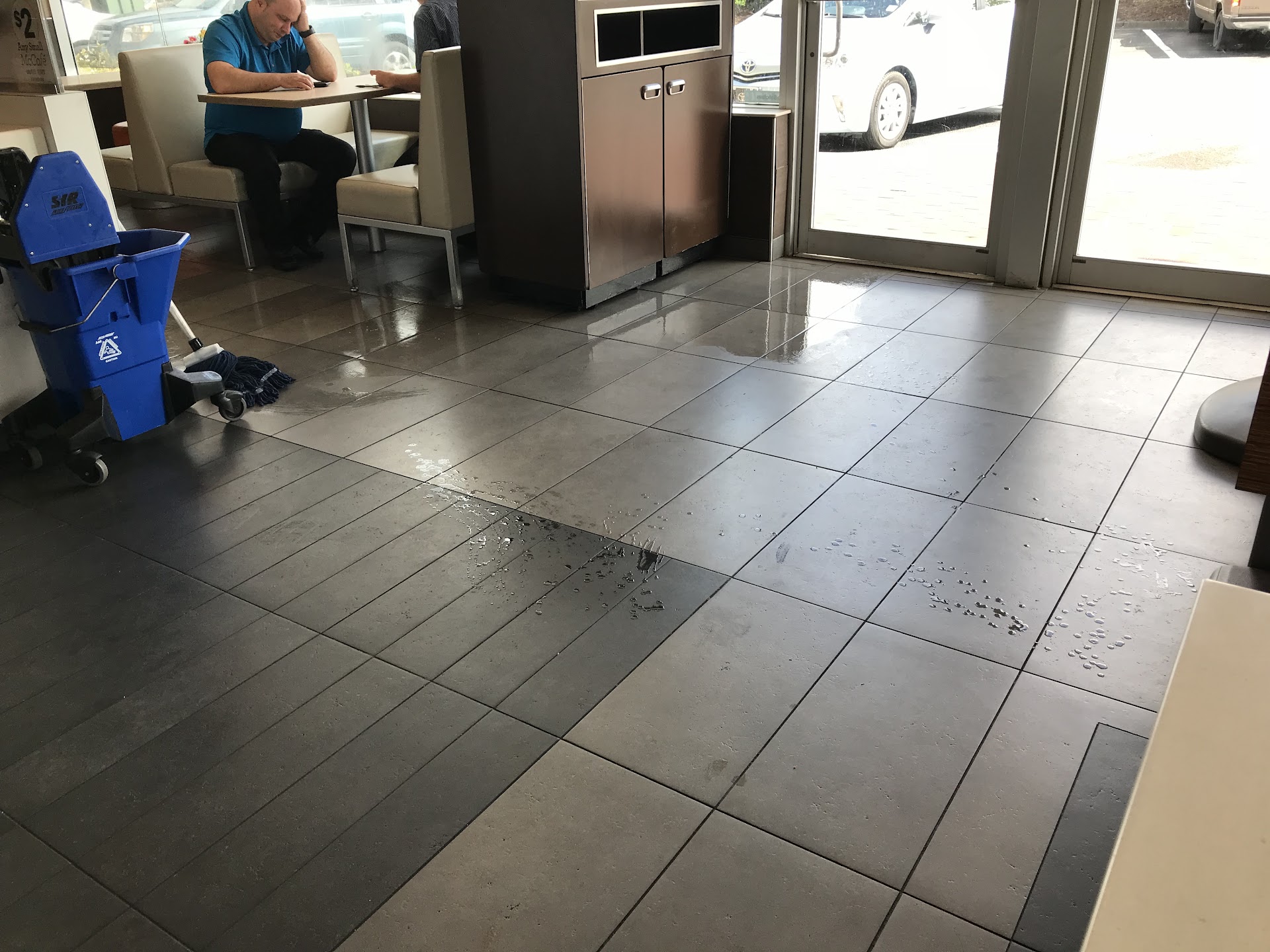 Then, there is the safety issues and cleanliness. I’ve been in there a few times when I’ve almost slipped. Yesterday, during my time in there trying to correct the 4 things they messed up (out of 7 total items), I took the attached picture. The person mopping just left a majorly wet floor at the front door to go do something and then came back to finish the rest of the entry way. Not until he was totally finished did he ever stick the wet floor sign up...like 6 feet away from the front door.