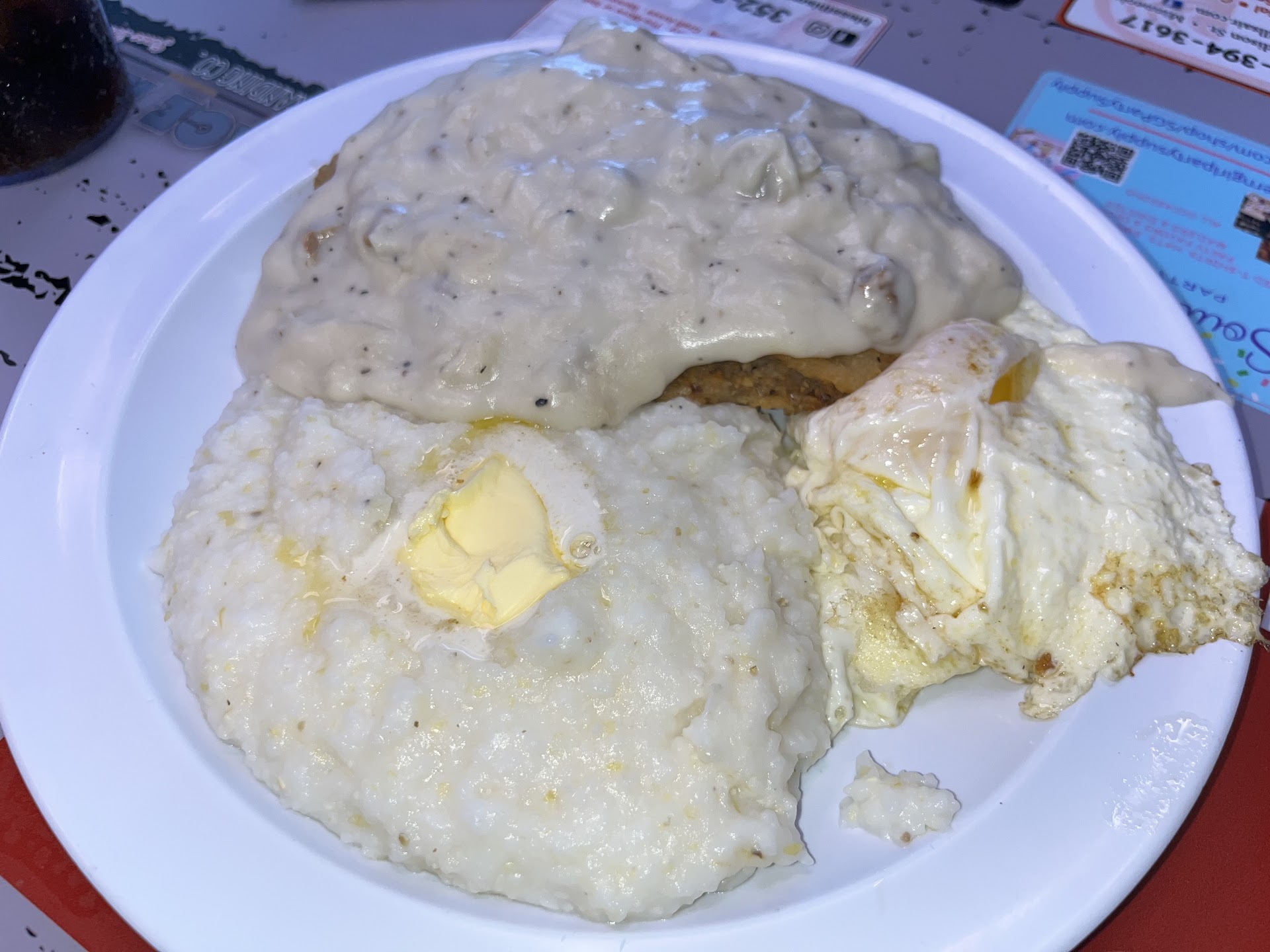 What a great place. Feels like you’re at home. Visiting the area and dropped by while my car was being worked on. The staff is very friendly and the place has a nice warm vibe. It’s obvious this is a definite local hangout. The menu is super. They have a wall board with specials not on the menu, like fish and grits, which was very tempting. Since it was my first time, I thought I would order standard dishes to compare them to other places we visited. The server was wonderful. Very friendly and conversant. My wife ordered the country fried steak and eggs, and I got a three meat omelette. We chose different breads, a biscuit for my wife and rye toast for me. The food was promptly delivered, piping hot. The toast was nice and hot too. The country fried steak was big and the gravy tasty. The grits were good and served with margarine. I prefer butter and asked the server, which she brought out promptly. The eggs over easy were on point! The omelette was generously big, with plenty of meat inside. It looked like the omelette was cooked at a high temperature which led to the outside being browner than I like, and the inside a little wetter than I like. That said, it was delicious and I enjoyed it. Definitely worth a visit!