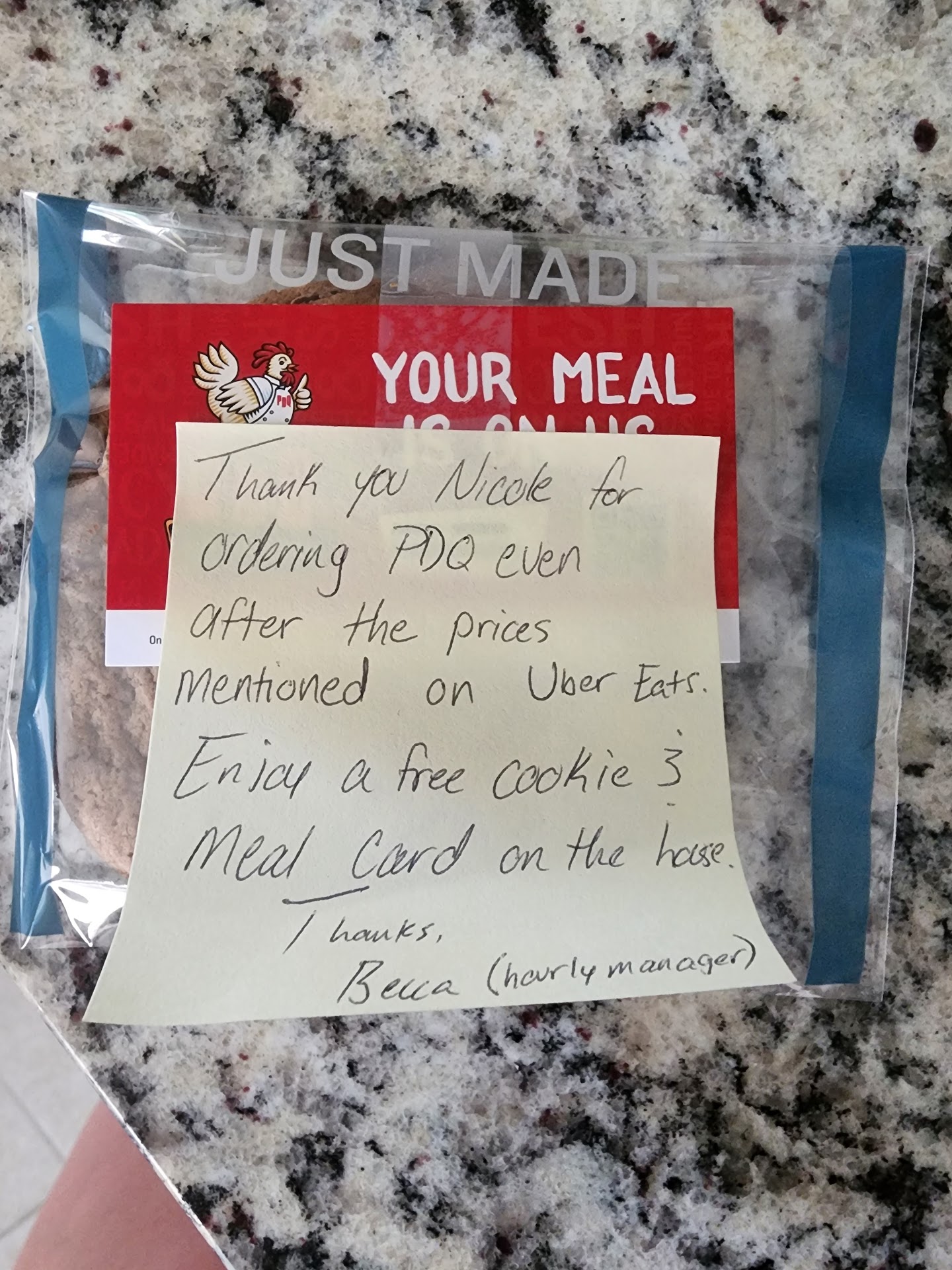 Read moreI went to the drive thru and ordered a grilled Buffy blu sandwich before my very long overnight shift for work. Once I got to work I decided to eat my sandwich first. I noticed the chicken was not grilled. I called the restaurant that I went to to inform them thinking they would just take my name down and I could come back another time. But instead the manager Robert said he would deliver me a new sandwich! Robert went above and beyond to correct the minor issue and I think he deserves to be recognized for his great actions. My family and I has started going to pdq way more frequently within the past two months and enjoy it way more than the competitor Chick-fil-A. I have never had someone from a restaurant go the extra mile and deliver me my correct order! Pdq has absolutely won us over as a family will continue to keep coming to the restaurant as frequent as we have been (2-3 times a week). My husband and I went again for lunch 8/21/2020 and used one Out of my Two free meal coupons that Robert also gave me. As we finished eating it began pouring. We sat and tried to wait the storm over but decided to go ahead and head out. There was a very nice kid who walked me out to my truck with an umbrella. I did not get his name, but it was 3:30pm. My family greatly appreciates the fact that pdq still values customer service and...