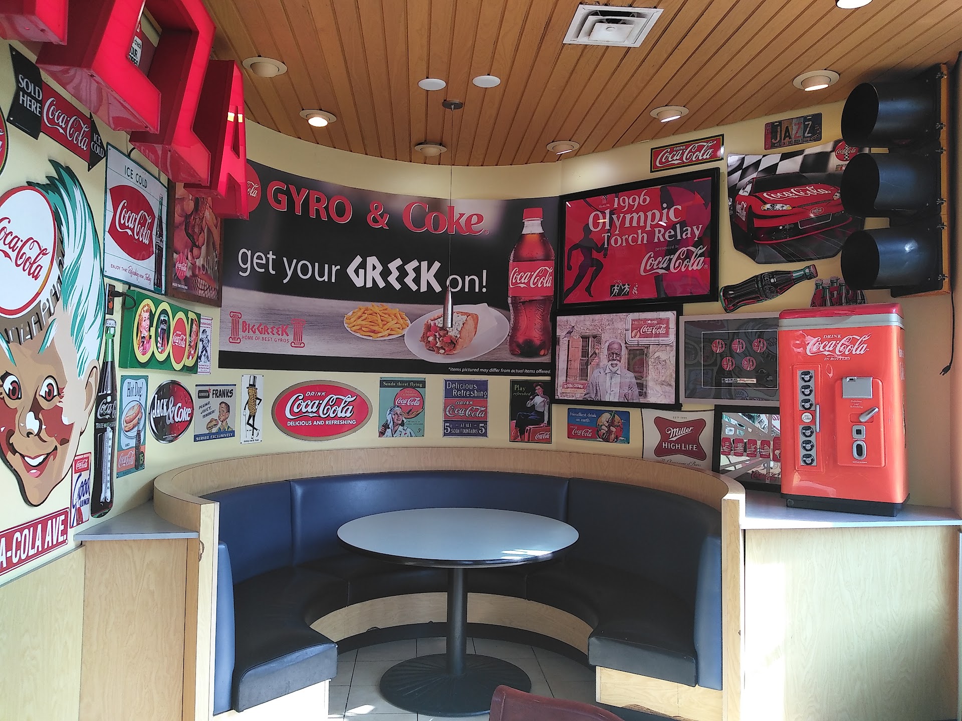 Pros: Friendly staff. The chef and the owner/manager greeted me. The owner owner/manager gave me a lesson in their unique baklava recipe. Amazing, cool ambience. The decor has a Greek diner feel to it. The round booth is a unique use of space. The outdoor space was closed for now. Good food. The gyro was very tasty and up to par from what I would expect. The falafel was okay, but I've had better. The baklava was very sweet, textured, but overly syrupy. They recommend pairing baklava with the ice cream. Covid cautious staff who wear masks and gloves. Clean restaurant.