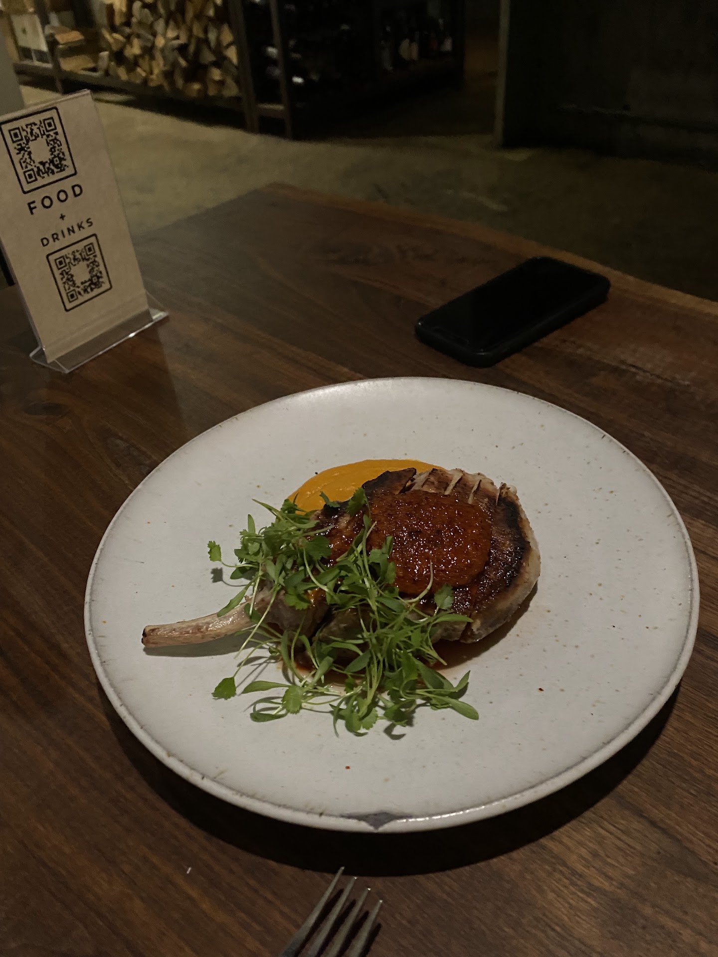 The atmosphere is great - cozy, modern, and good music playing throughout the meal (but not too loudly). The relatively small space makes sure there is a "buzz" in the air with background noise, music, and conversation. The layout is modern and relatively minimalist, with the wood-fired stove/grill being the centerpiece behind the "bar." Wait staff is friendly, funny, and outgoing. We were checked on multiple times and never sat with an empty beverage or wondering when someone would take our order.