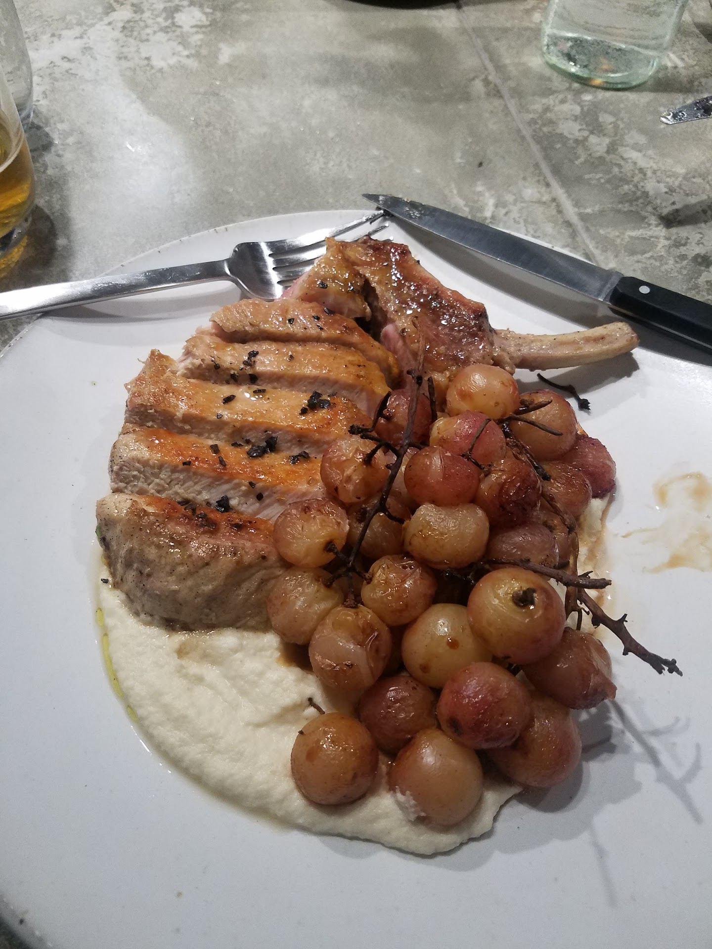 The FOOD! The food is phenomenal. We split the grilled oysters and malfatti, both of which were amazing. I will say that it took a while for our food to come out, likely because of how packed it was and how limited the cooking space is. Still, it wasn't problematically long, and neither of us were impatient by the time it arrived. For the main, I got the pork chop with grilled grapes and she got the picanha steak. The steak was very good (especially with the white cheese sauce - WOW), but the pork chop and grilled grapes were out of this world. It is my favorite meal in Cleveland, and I have been EVERYWHERE. I am going to dream of those grapes!!