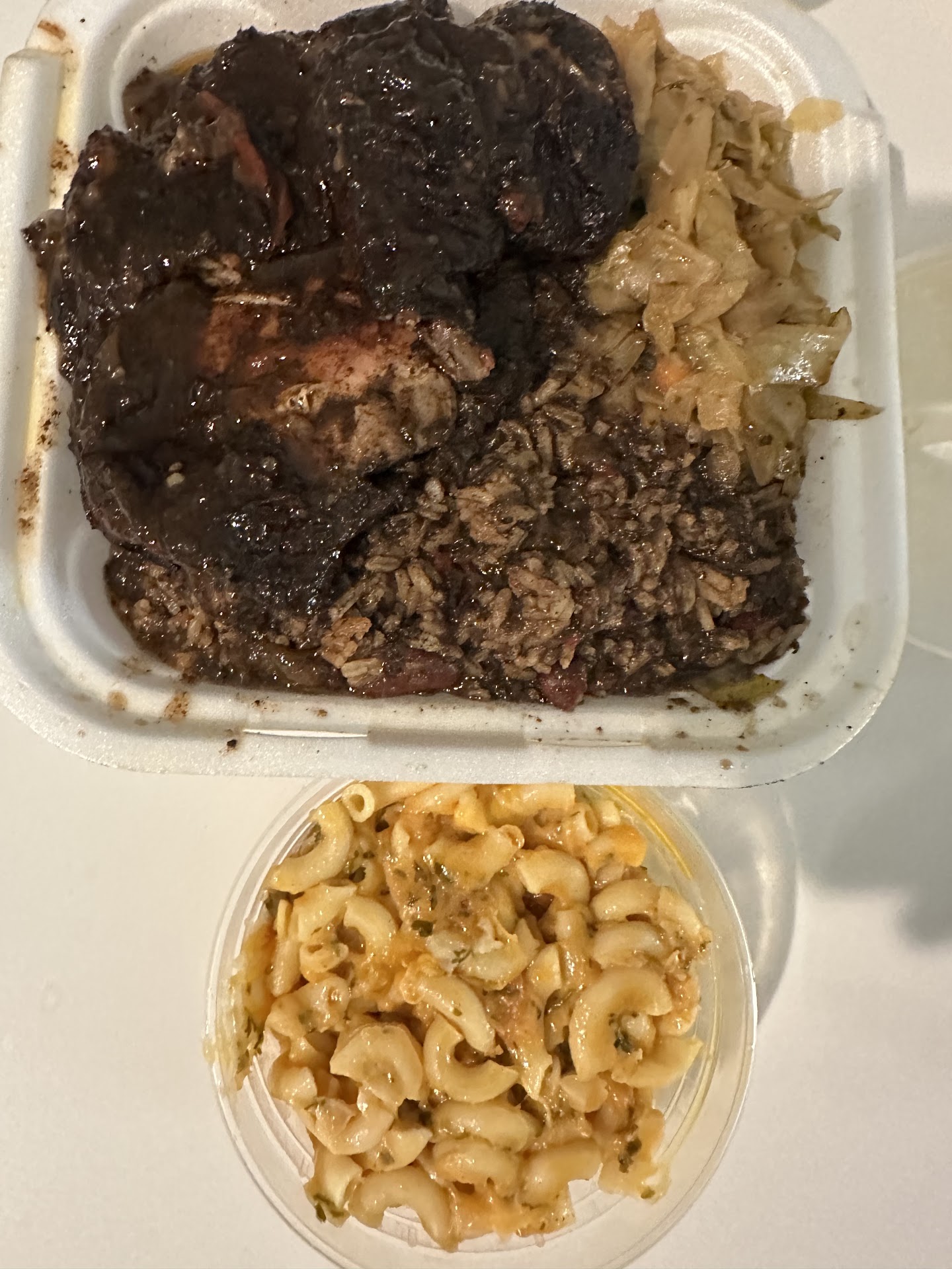 I ordered a mild jerk chicken plate, which came with rice and peas and cabbage. I also added a side of mac n cheese and some plantains.