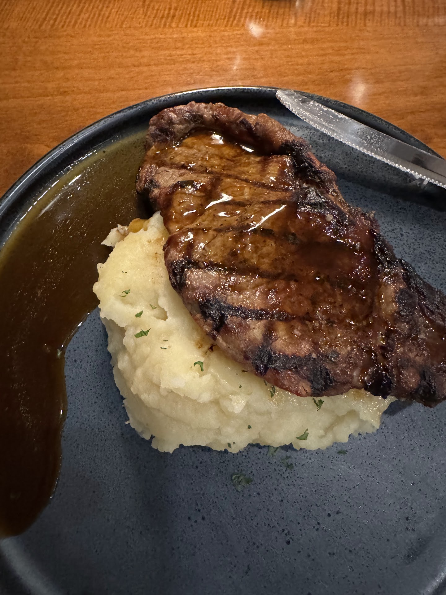 First time in Cleveland and staying a few days at the Crowne Plaza for a conference. Decided to get dinner at the Ghost Light after settling into our hotel room. Josh, the Food & Beverage Manager, was extra accommodating for my multiple food allergies and even had the chef visit our table to help me decide what would be safest for me to order. Very welcoming, professional, and friendly staff. Star was our designated server and was super attentive with 110% customer service. I ordered the grilled New York Strip medium-well without the glaze and with extra potatoes. My husband ordered a jasmine tea since he already ate before me.