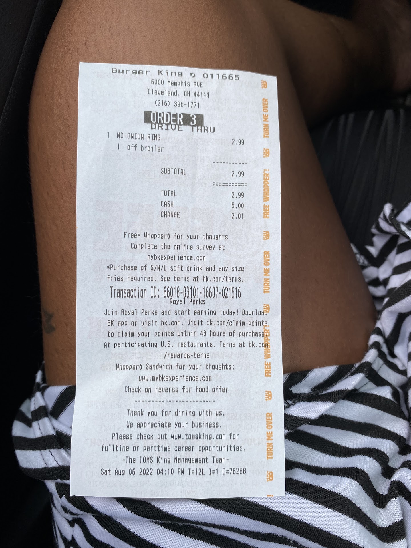 Read moreMark it down. The Burger King on Memphis Ave in Old Brooklyn is the absolute worst. We went through the drive through because the dining room was " temporarily " closed. We waited so long at the ordering station we wondered if anyone was there. When she finally acknowledged us you knew she had an attitude. My spidey senses said go ! But my friend , who's from Mexico , seemed right at home with the rude service . We were catching up , so I wasn't paying attention to the prices but he got the double whopper meal with cheese and I got the BK bacon burger. The total cost was $19. 61. When we got to the window for our meals. Ms. Attitude was there. My friend was driving, otherwise at this point I would have made some compassionate conversation with her, like asking if everything was ok , and did she get stuck alone because workers called off, but my friend was mute. We received our goods and split . When we got back to my house, we paid nearly $20. for a regular cheeseburger and a whopper sized double cheeseburger with nothing but the meat, cheese and bun. We should have looked first I know. I also know better not to go back to that dump. Like I said the attitude of the receptionist was a red flag , as well as the overflowing trash cans. That place has a third world feel to it. Save your money and go...