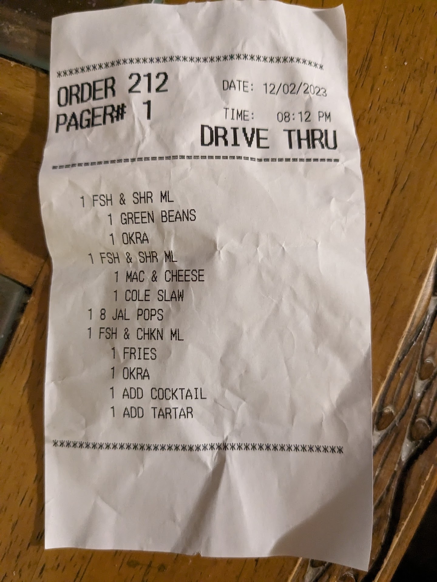 Read moreOrdered the seafood feast, added extra side. We get home after waiting forever in the drive-through line and we had no crab cakes or shrimp or hush puppies and there were not even enough pieces of fish for the meal. We paid $38. I call back to the store and was told I couldn't have my money back but to come by some day when it was convenient to get those items that were missing. And I'm thinking what is the point of that because I have to spend gas to go out there again and then I don't have enough food for a meal in that. I just want you to give me my money back for the items I didn't get. Which is equivalent to about 10 to $12 I was told I couldn't have my money back and the manager themselves Would not come to the phone to speak to me. Don't ask for much I just want my order right , and maybe the manager to actually care if the food is wrong and remedy...