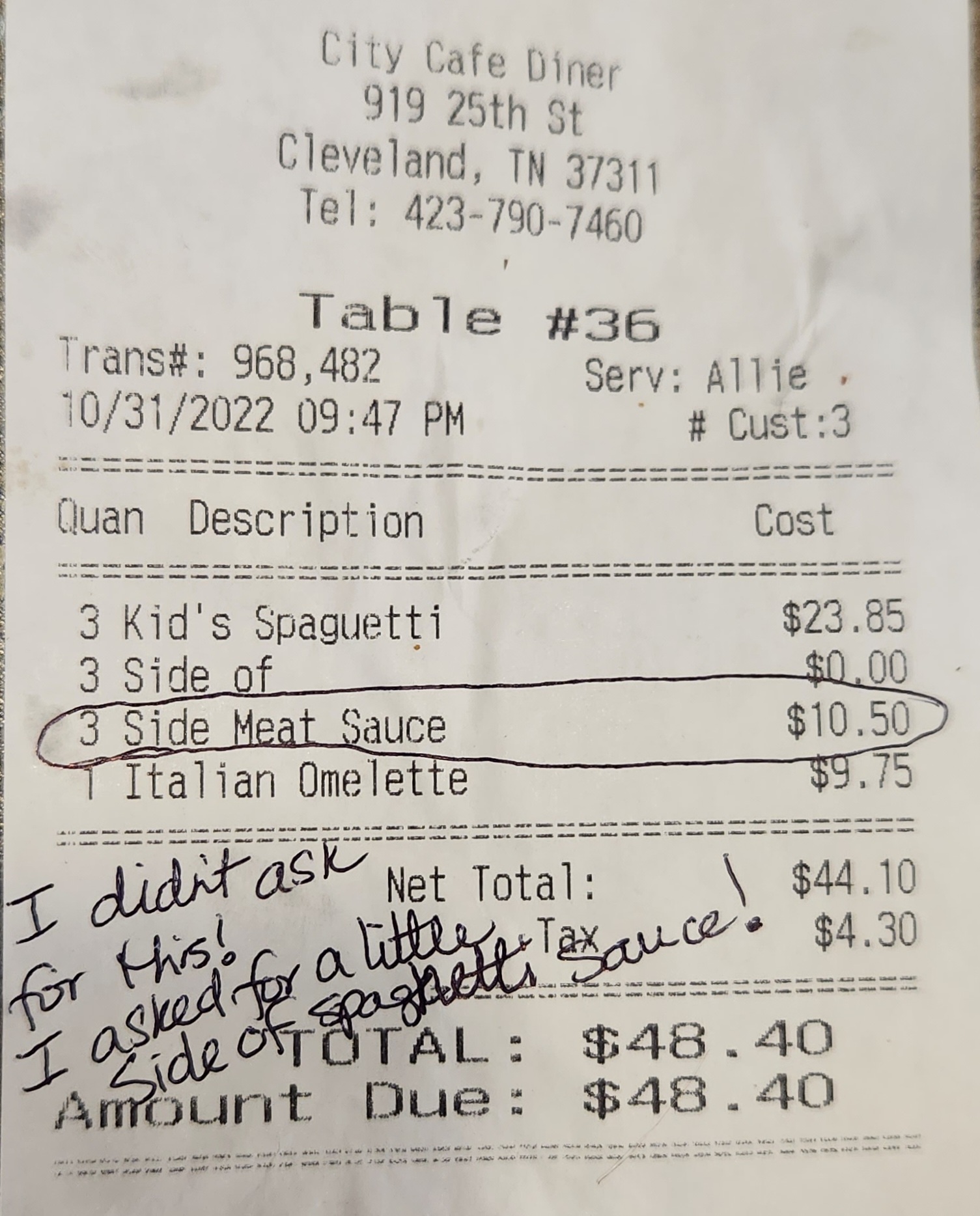 Well, fast forward to the bill... $10.50 charge for 3 sides of meat sauce! Jaw-dropped, I asked the waitress why the charge when I only asked for a side of spaghetti sauce (I believe it was usually around $1.25?). She said the manager told her to ring it up that way. I disputed as that's not what I asked for. She checked, again, and he said since it was consumed it was on us. (WHAT?!) So I asked for him personally. He stood his ground (included with an attitude from approach), even after I asserted that all I asked for was "A SIDE OF SPAGHETTI SAUCE," and instead a meat sauce was added to all of the plates and my hungry children ate it because it looked like it always did; that because they ate it, it would cost us. I didn't order it. I didn't order it as a "meat sauce" (I order spaghetti sauce). I didn't order THREE! I didn't order it ON THE PLATES. BUT I was billed for it--AT $3.50 PER PLATE (on a kid's plate, at that). Their small plates of spaghetti cost almost $11.50 each! (More than my adult meal!)